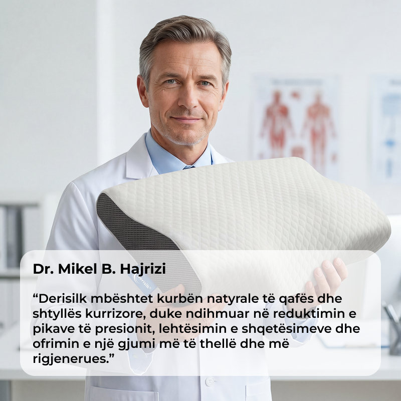 DERISILK është krijuar për ta korrigjuar këtë që nga nata e parë. Struktura e tij ergonomike me shkumë memorie mbështet kokën, qafën dhe supet në një pozicion më të shëndetshëm gjumi, lehtëson presionin në pikat kryesore të kontaktit, dhe e kthen gjumin e ndërprerë në pushim të thellë, pa dhimbje dhe rigjenerues.