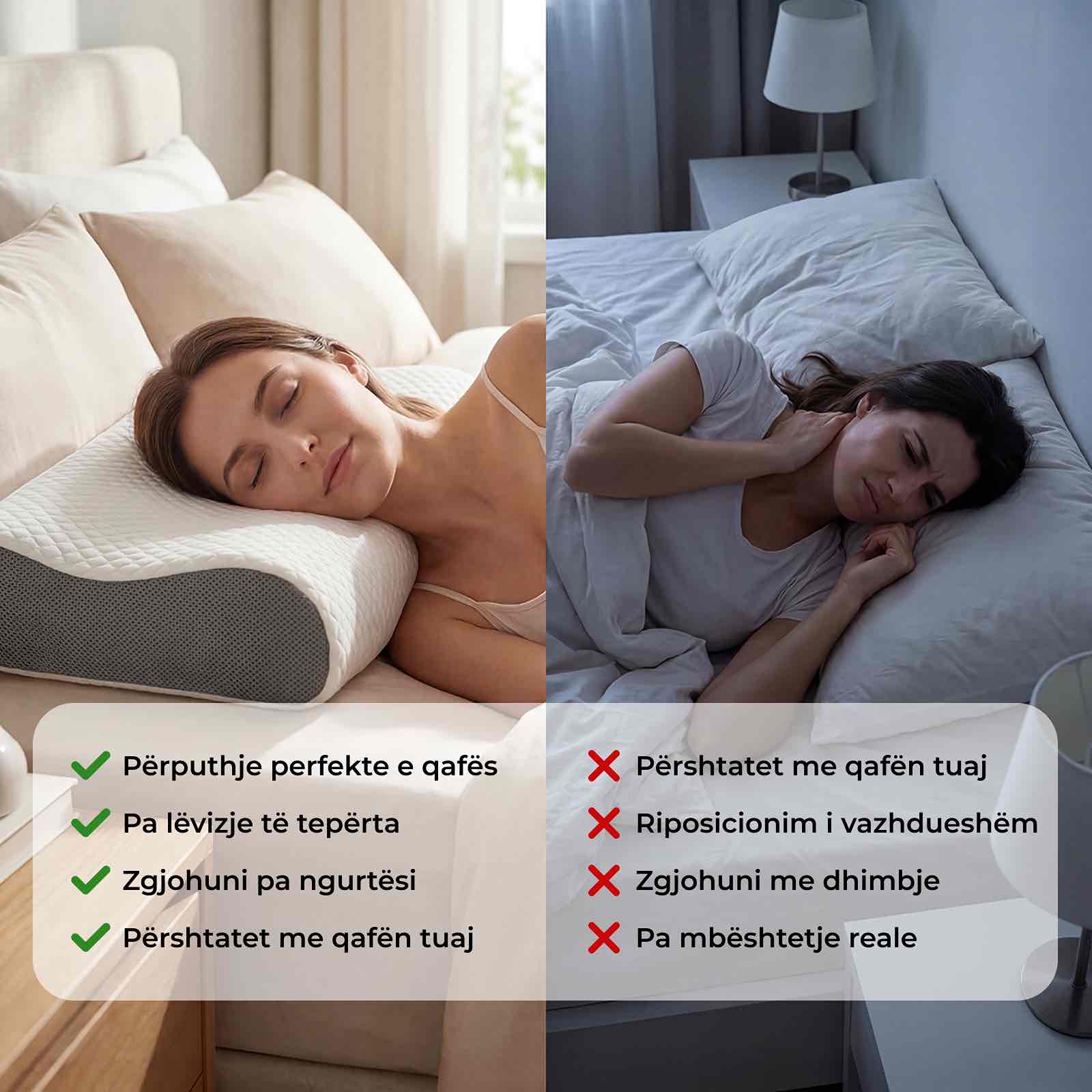 Një nga shkaqet kryesore të dhimbjes së qafës, tensionit në shpatulla dhe gjumit të dobët është mbështetja e pasaktë e kokës dhe qafës gjatë natës. Kur jastëku yt është shumë i lartë, shumë i ulët ose humbet formën nën presion, ai prish drejtimin e shtyllës kurrizore, rrit tensionin muskulor dhe ngushton rrugët e frymëmarrjes, duke krijuar parehati që shtohet për orë të tëra ndërsa fle.