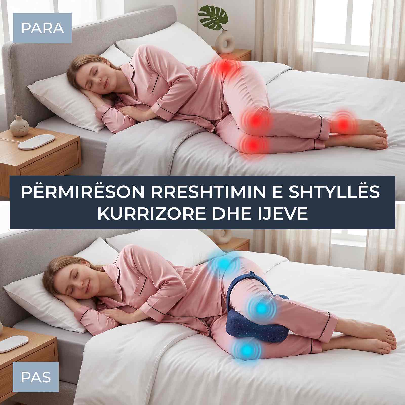 Kërkimet tregojnë se një nga shkaqet kryesore të parehatisë në ijë, gju dhe pjesën e poshtme të shpinës gjatë gjumit anash është mungesa e mbështetjes së duhur midis këmbëve. Kur këmba e sipërme bie përpara, mund të ushtrojë presion rrotullues mbi ijet dhe shtyllën kurrizore, të prishë pozicionin natyral dhe të krijojë tension që shtohet gjatë natës.