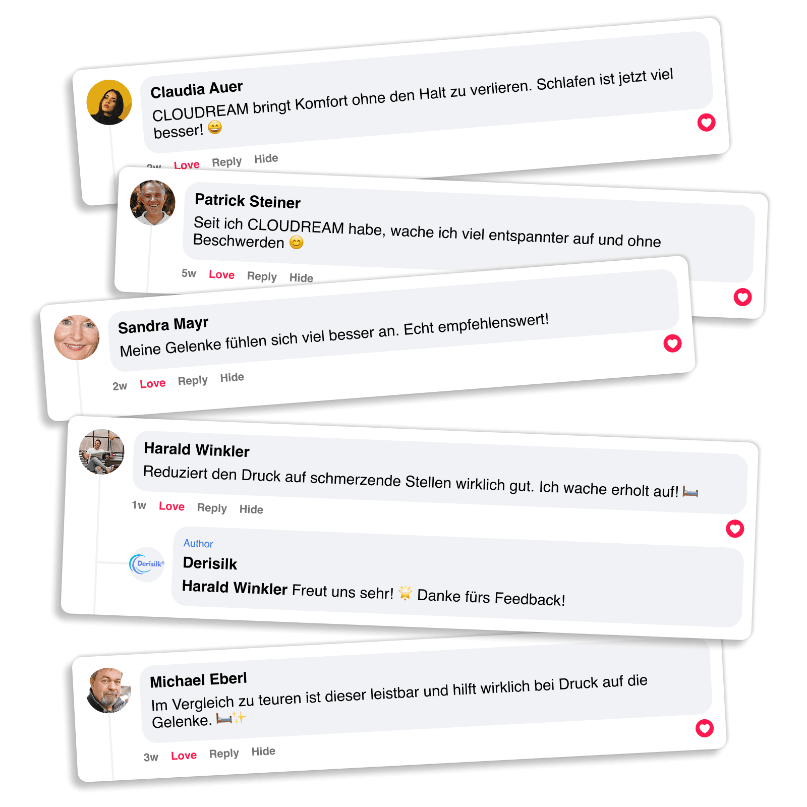 Wir sind überzeugt, dass du den Unterschied mit CLOUDREAM schon in den ersten Nächten spürst. Deshalb ist jede Bestellung durch unsere Zufriedenheitsgarantie über 90 Nächte geschützt. Wenn du nicht vollständig zufrieden bist, kannst du ihn innerhalb von 90 Tagen nach Lieferung gegen volle Rückerstattung zurückgeben.