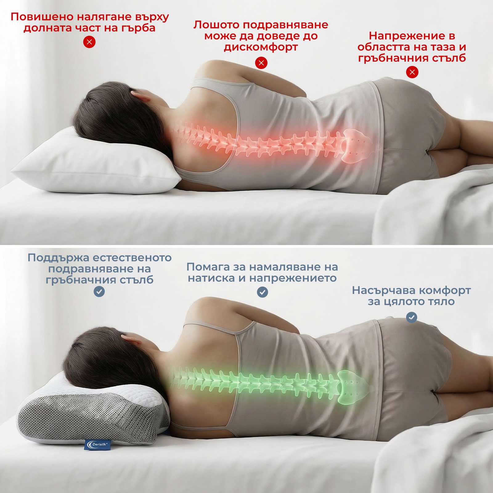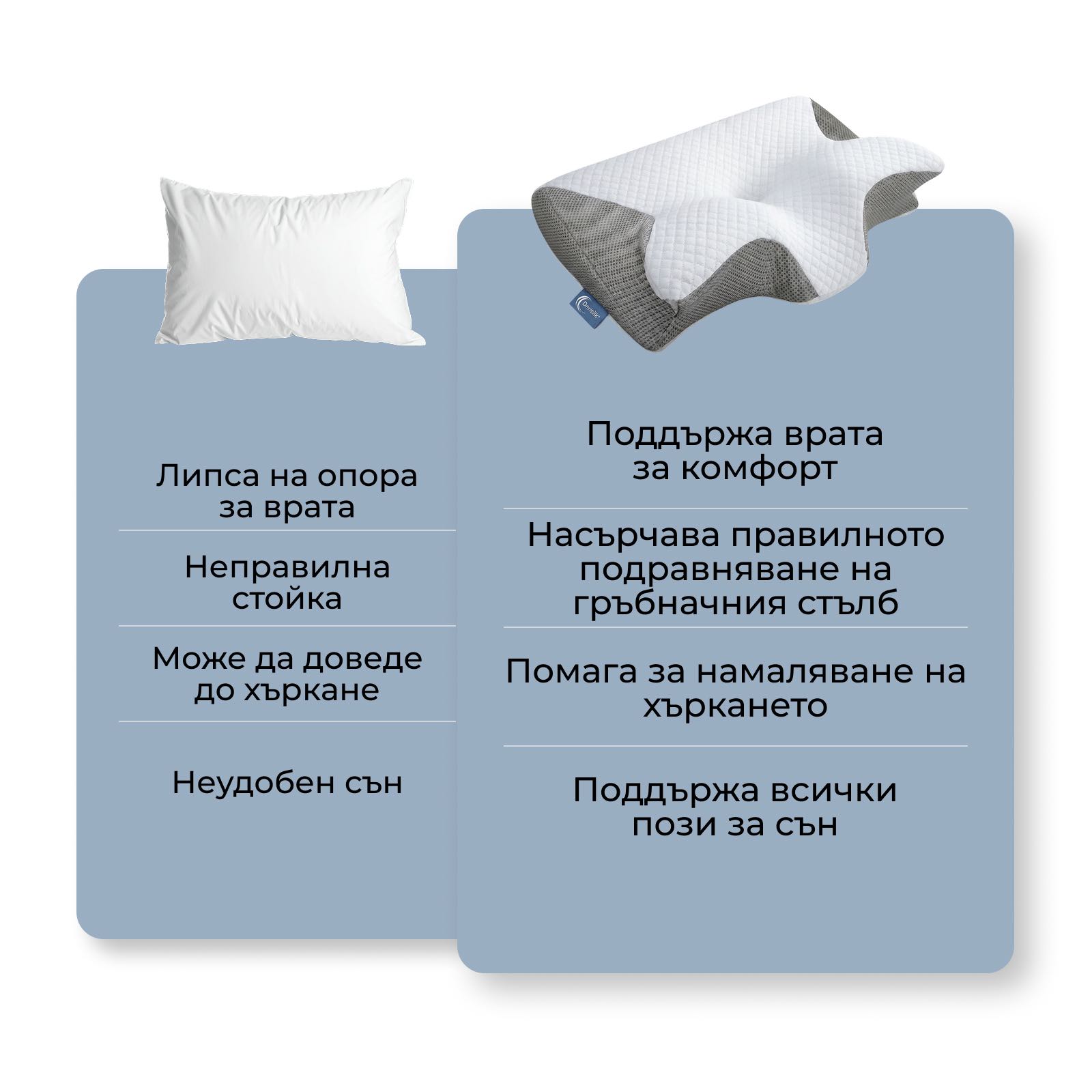 Обикновената възглавница може да остави врата ти без опора с часове, да принуди главата ти в неправилен ъгъл и да натрупа напрежение във врата, раменете и горната част на гърба. Нощ след нощ това неправилно положение може да доведе до схващане, нервно напрежение, неспокоен сън, хъркане и сутрини, изпълнени с болка, умора и ограничена подвижност.