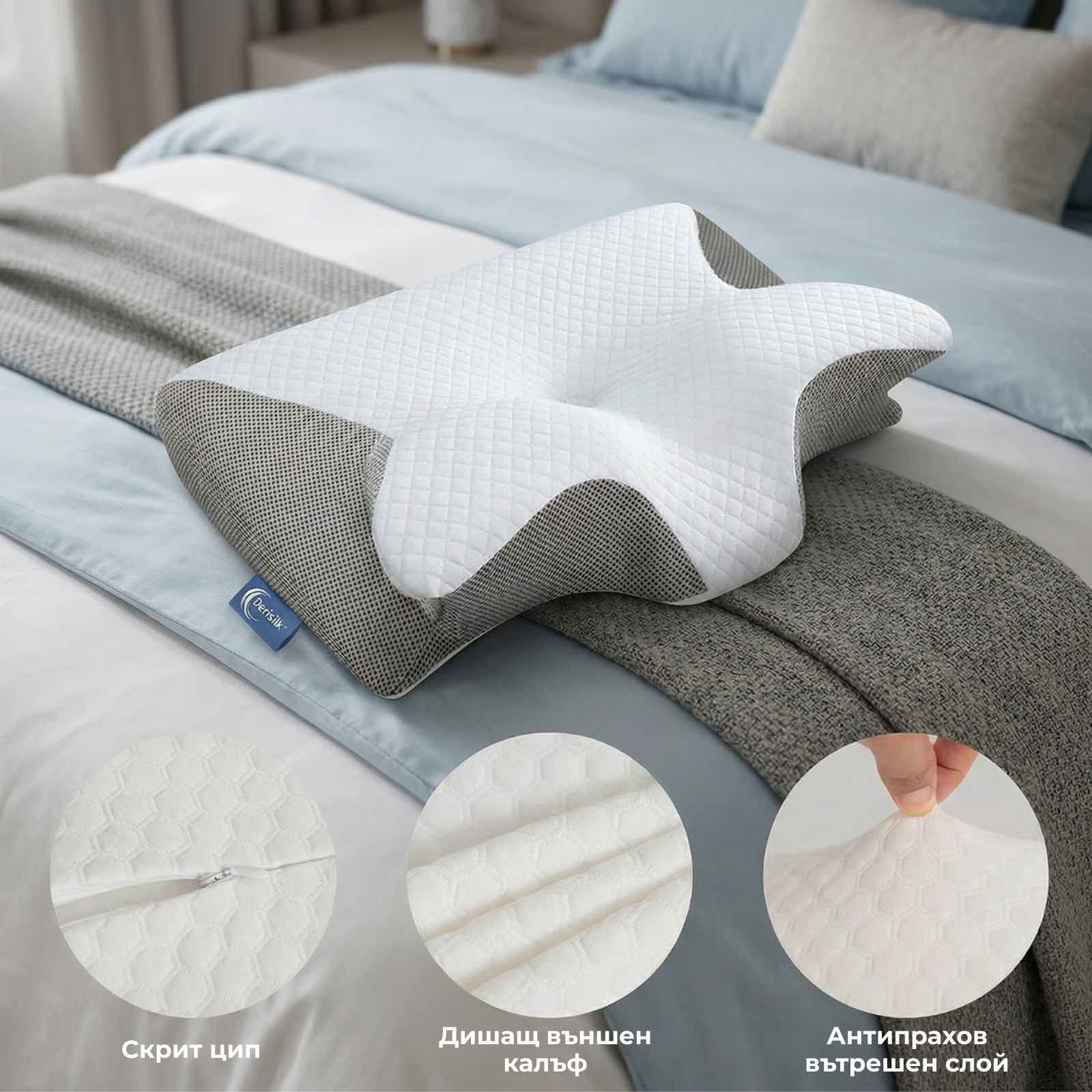 Ергономичната възглавница е проектирана с идеален баланс между твърдост и комфорт, за да отговаря на различни предпочитания и да осигурява необходимата шийна опора за спокоен сън без болка.