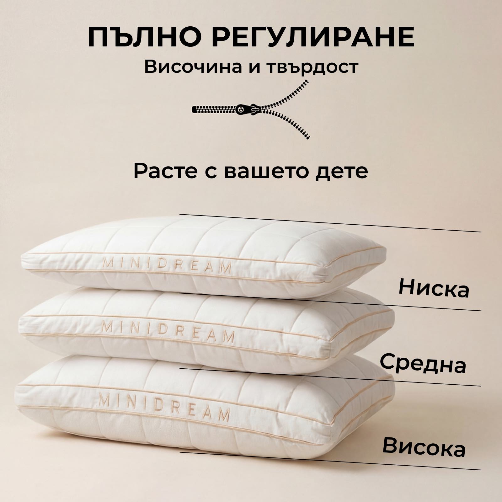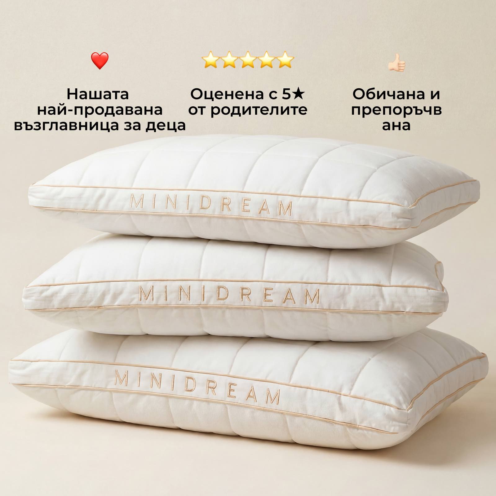 MINIDREAM е създадена, за да реши този проблем от самото начало. Благодарение на регулируемия пълнеж, ергономичната опора и дишащите естествени материали тя помага за по-здравословна позиция на врата и гръбнака, намалява прегряването и създава спокойна, удобна среда за сън, от която децата се нуждаят за по-дълбока и възстановяваща почивка.