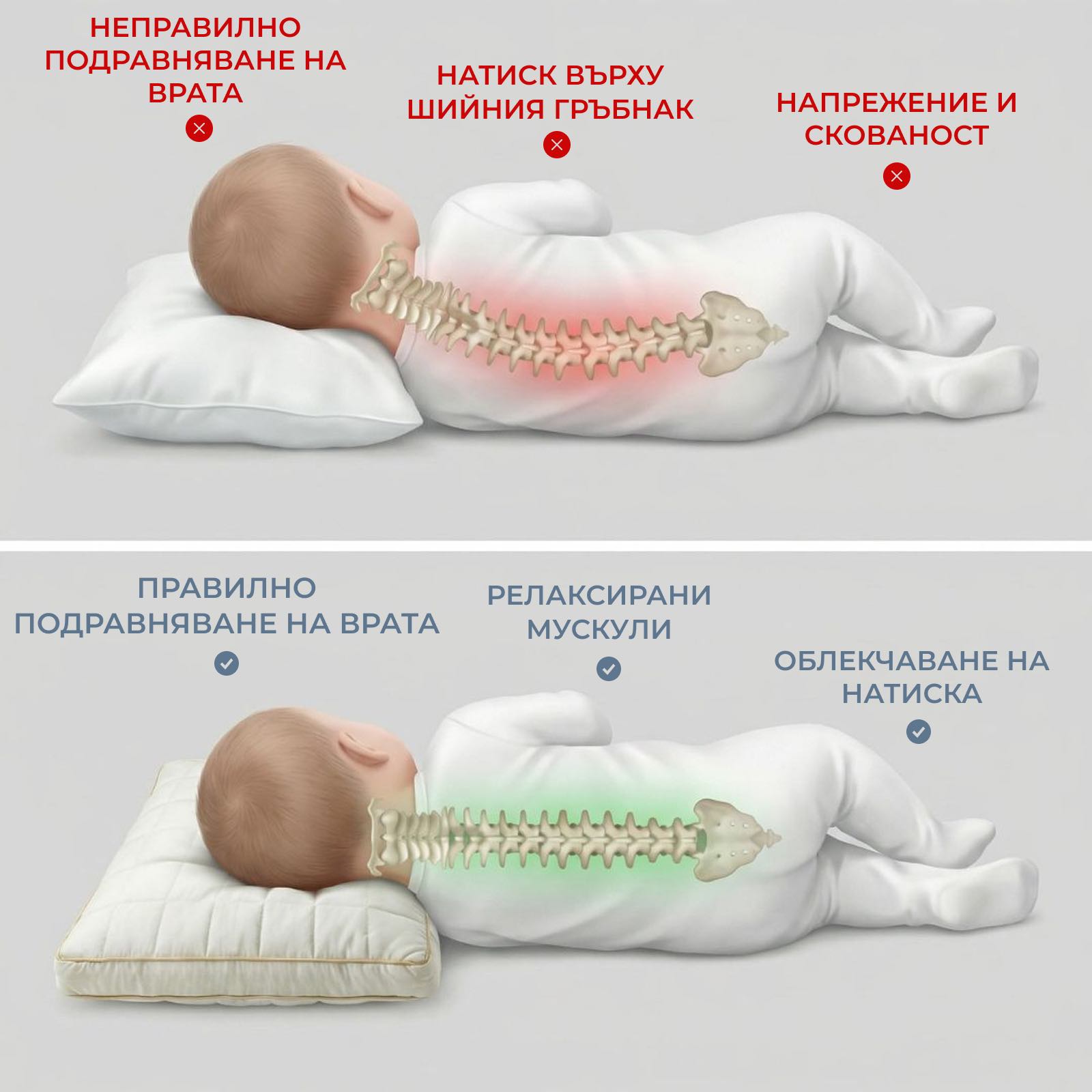 - Дискомфорт от възглавници, които са твърде високи или твърде плоски