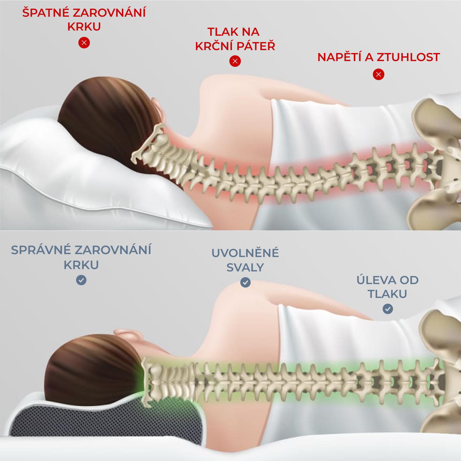 Jednou z hlavních příčin bolesti krku, napětí v ramenou a špatného spánku je nesprávná opora hlavy a krční páteře . Když je polštář příliš vysoký, nízký nebo ztrácí tvar pod tlakem, narušuje správné držení páteře, zvyšuje napětí svalů a zužuje dýchací cesty, což způsobuje nepohodlí, které se během spánku stupňuje.