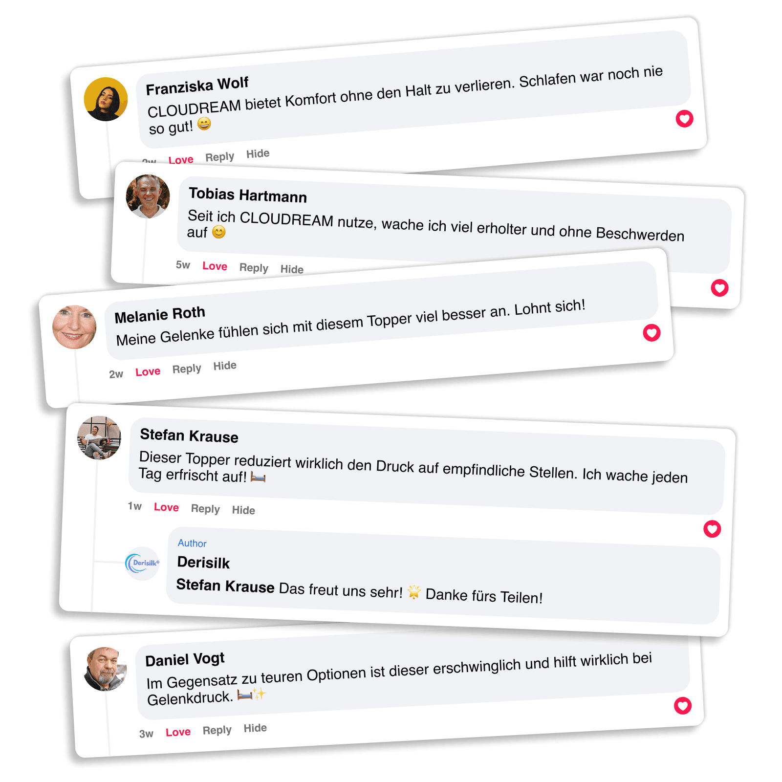 Wir sind überzeugt, dass du den Unterschied mit CLOUDREAM schon in den ersten Nächten spürst. Deshalb ist jede Bestellung durch unsere Zufriedenheitsgarantie über 90 Nächte geschützt. Wenn du nicht vollständig zufrieden bist, kannst du ihn innerhalb von 90 Tagen nach Lieferung gegen volle Rückerstattung zurückgeben.