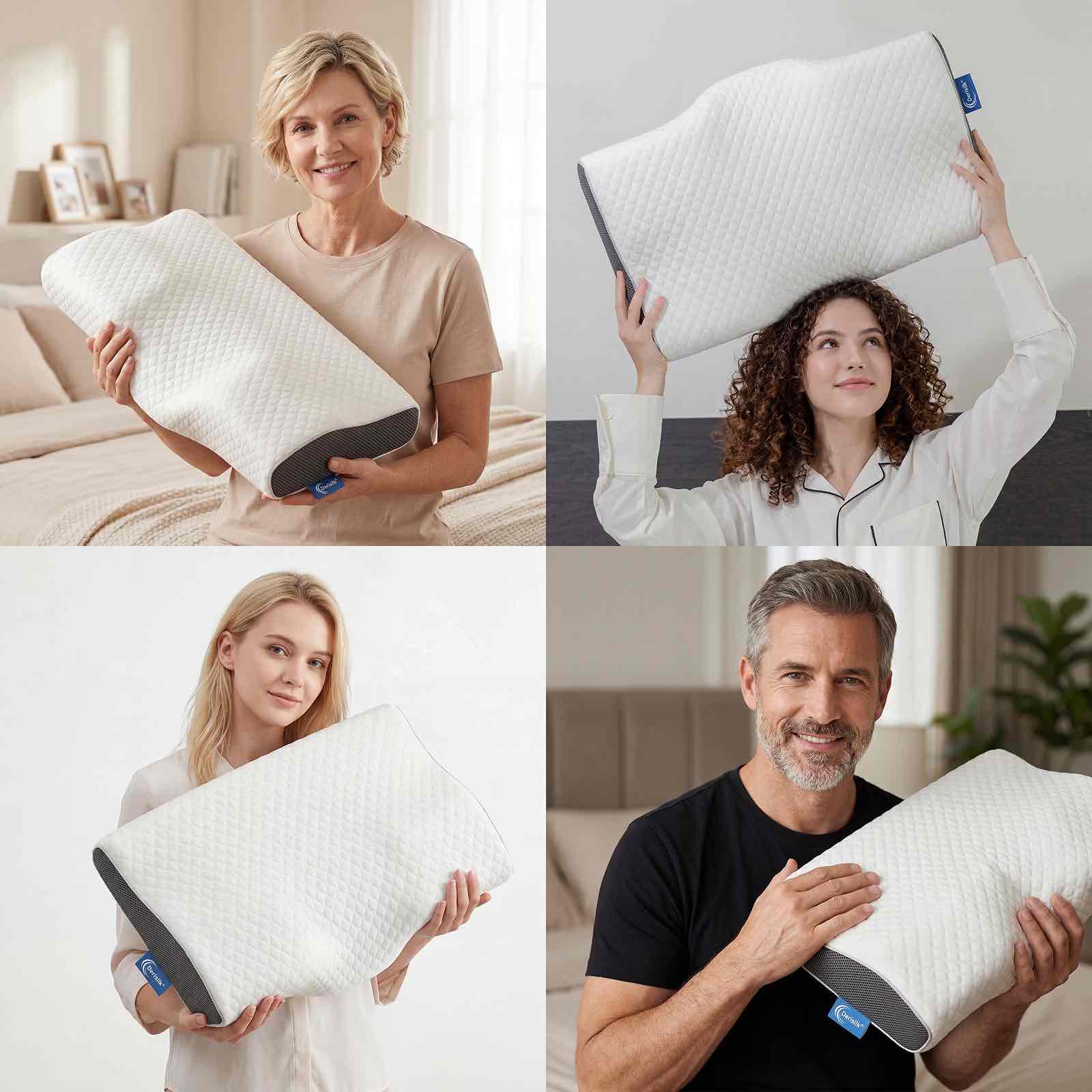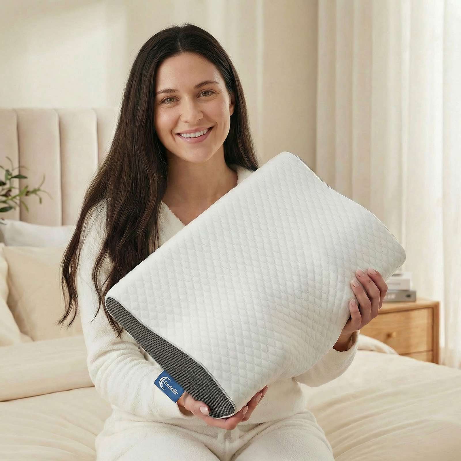 Das Problem beginnt oft mit dem falschen Kissen. Wenn ein Kissen platt wird, nachgibt oder die natürliche Krümmung deines Nackens nicht stützt, gerät deine Wirbelsäule aus der Balance und es entsteht Druck auf Nacken, Schultern, Kiefer und oberen Rücken. Nacht für Nacht führt das zu Steifheit, Schmerzen, Schnarchen, unruhigem Schlaf und morgendlicher Erschöpfung statt Erholung.
