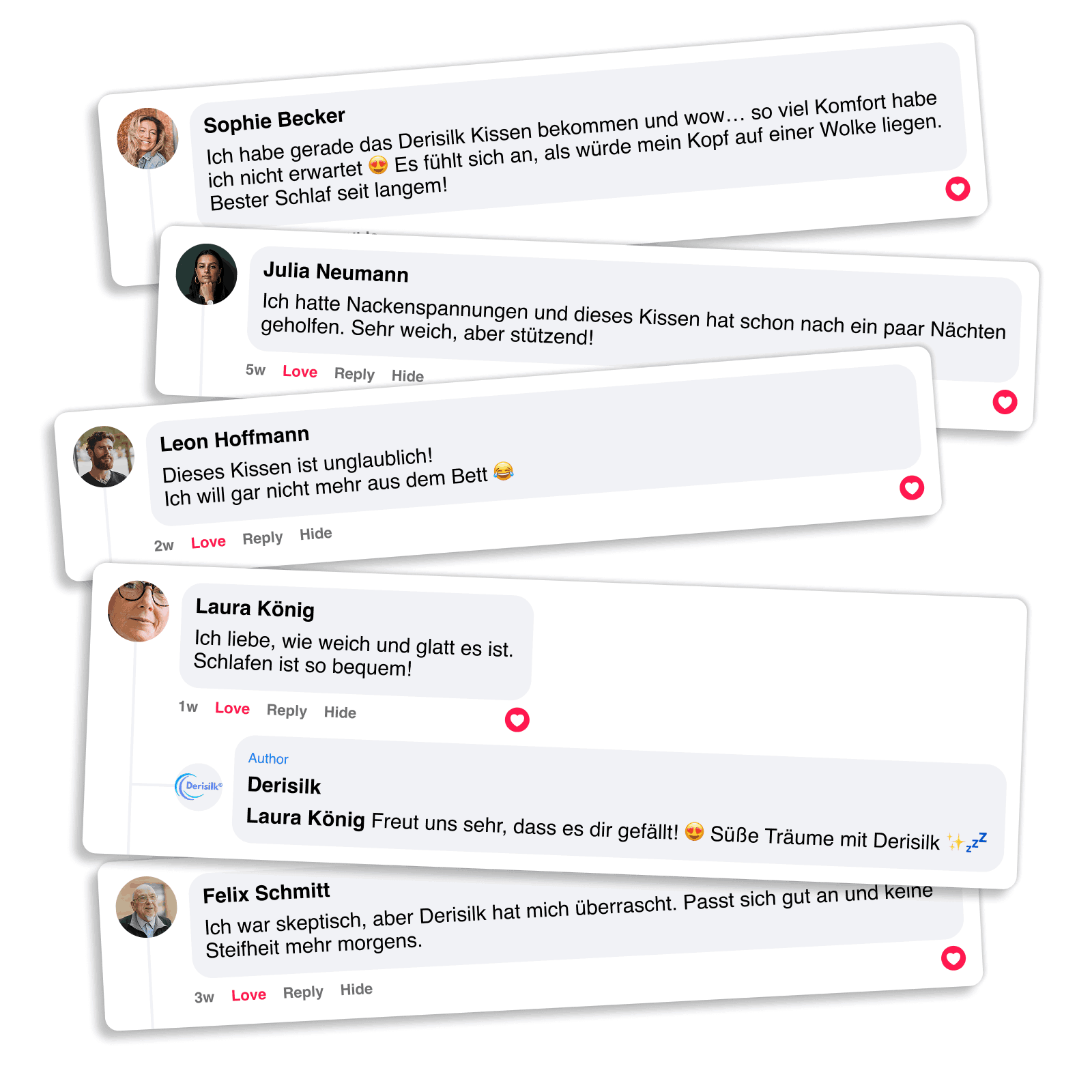 Im Gegensatz zu Standardkissen, die sich abflachen, verrutschen und nachts an Stützkraft verlieren, kombiniert DERISILK ergonomische Konturen, gezielte Stützbereiche und hochwertigen Memory-Schaum in einem fortschrittlichen Schlafsystem. Es wurde entwickelt, um die Ausrichtung zu verbessern, Druck zu reduzieren und dir zu helfen, erholter aufzuwachen.