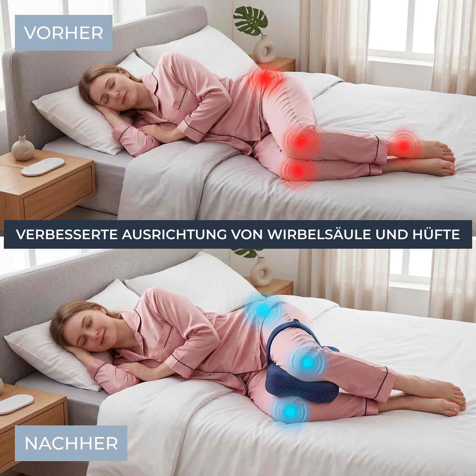 Wenn du auf der Seite schläfst, ohne eine richtige Stütze zwischen den Beinen, fällt das obere Bein nach vorn, verdreht die Hüften, belastet den unteren Rücken und drückt die Knie direkt gegeneinander. Nacht für Nacht kann diese Fehlstellung Druck im ganzen Körper aufbauen, Beschwerden in wichtigen Bereichen auslösen und dich steif, wund und erschöpft aufwachen lassen.