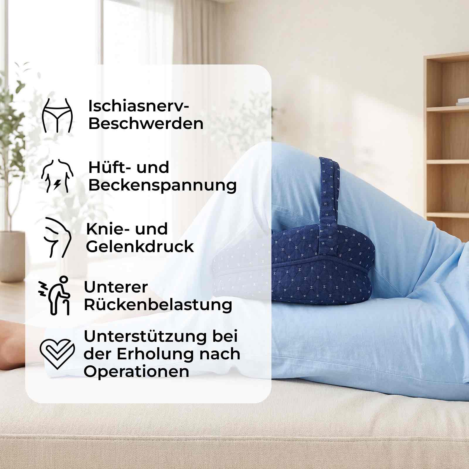 Studien zeigen, dass eine der Hauptursachen für Beschwerden an Hüfte, Knie und unterem Rücken beim Seitenschlafen fehlende Unterstützung zwischen den Beinen ist. Wenn das obere Bein nach vorn fällt, geraten Hüfte und Wirbelsäule unter Verdrehung, die natürliche Ausrichtung wird gestört und es entsteht Spannung, die sich über Nacht aufbaut.