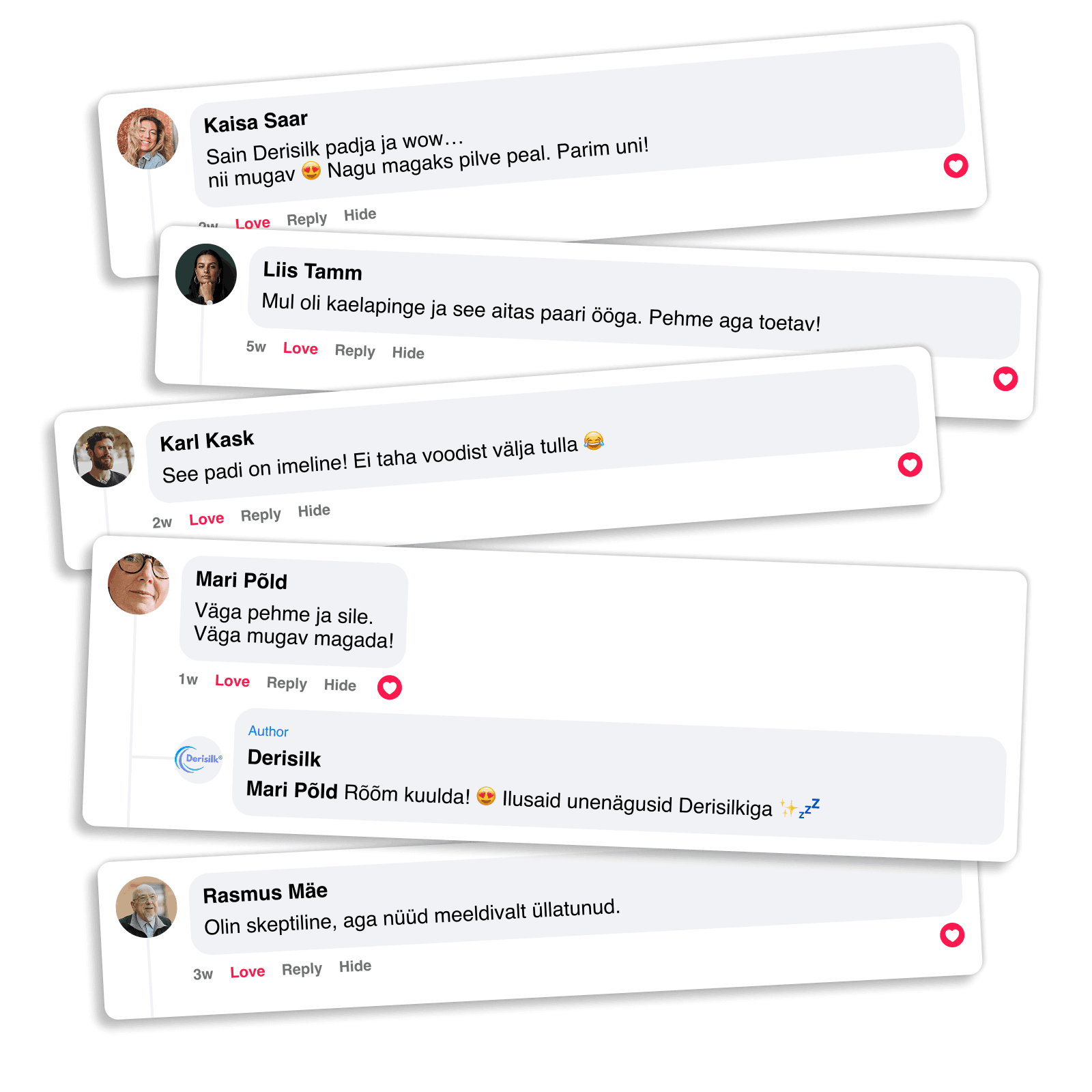 Oleme kindlad, et tunned DERISILK-iga erinevust juba esimestel öödel. Seetõttu on iga tellimus kaitstud meie 90-öö rahulolugarantiiga. Kui sa pole täielikult rahul, saad selle 90 päeva jooksul pärast kättesaamist tagastada ja saad kogu raha tagasi.
