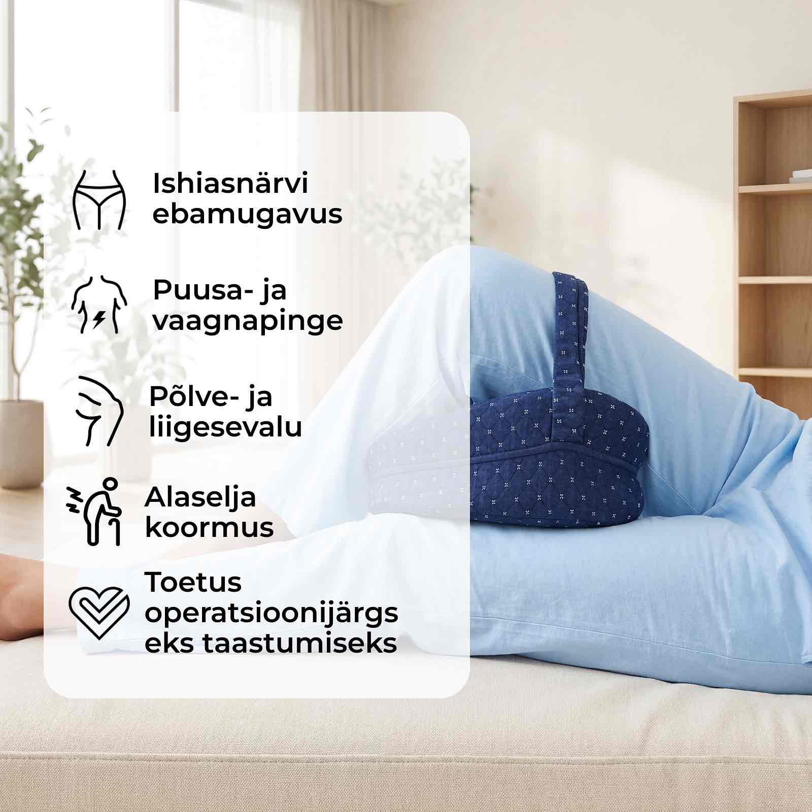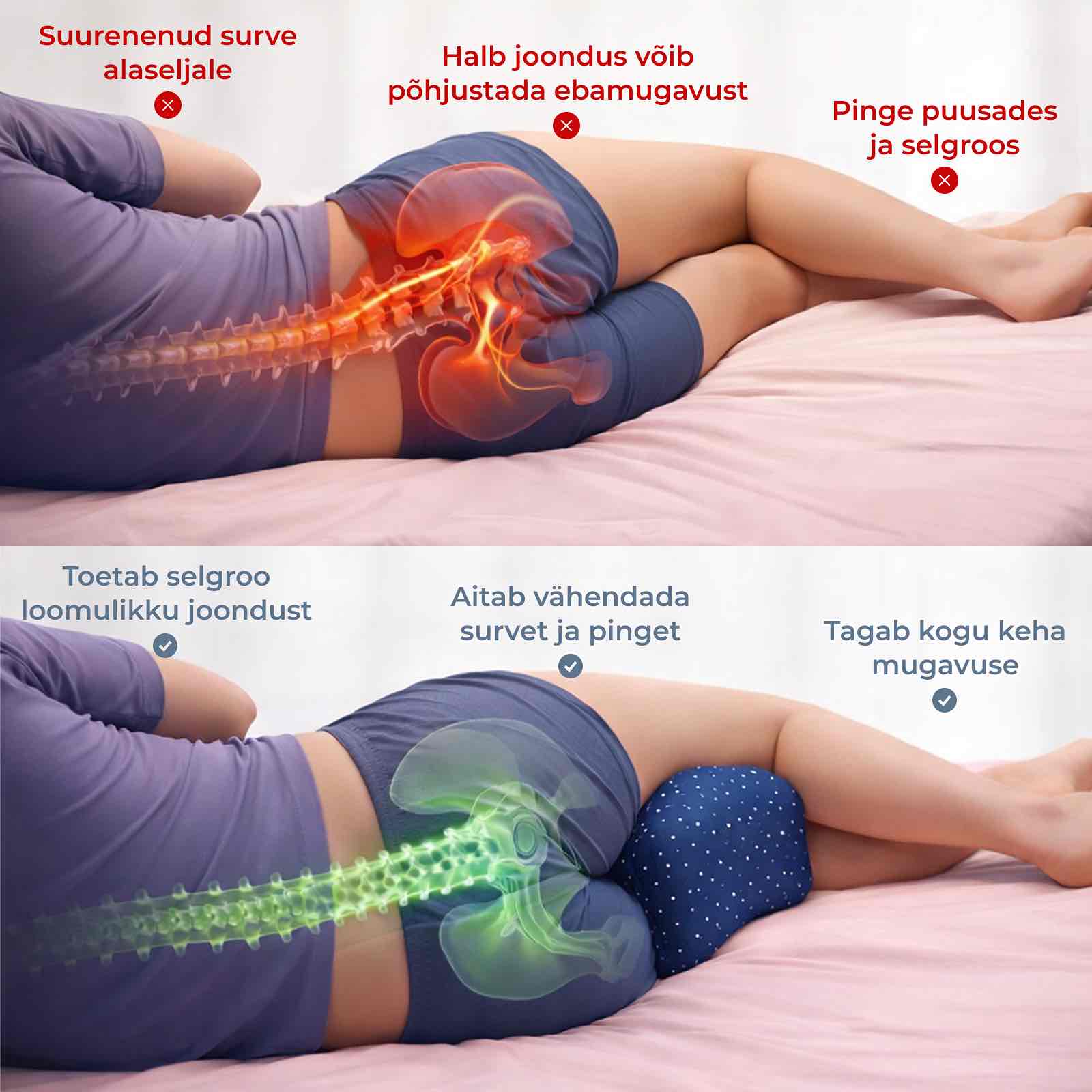Kui magad külili ilma korraliku toeta jalgade vahel, vajub ülemine jalg ette, keerab puusa, pingestab alaselga ja surub põlved kokku. Ööst öösse võib see vale asend tekitada kehas pingeid, põhjustada ebamugavust olulistes piirkondades ning hommikust kangust, valu ja väsimust.