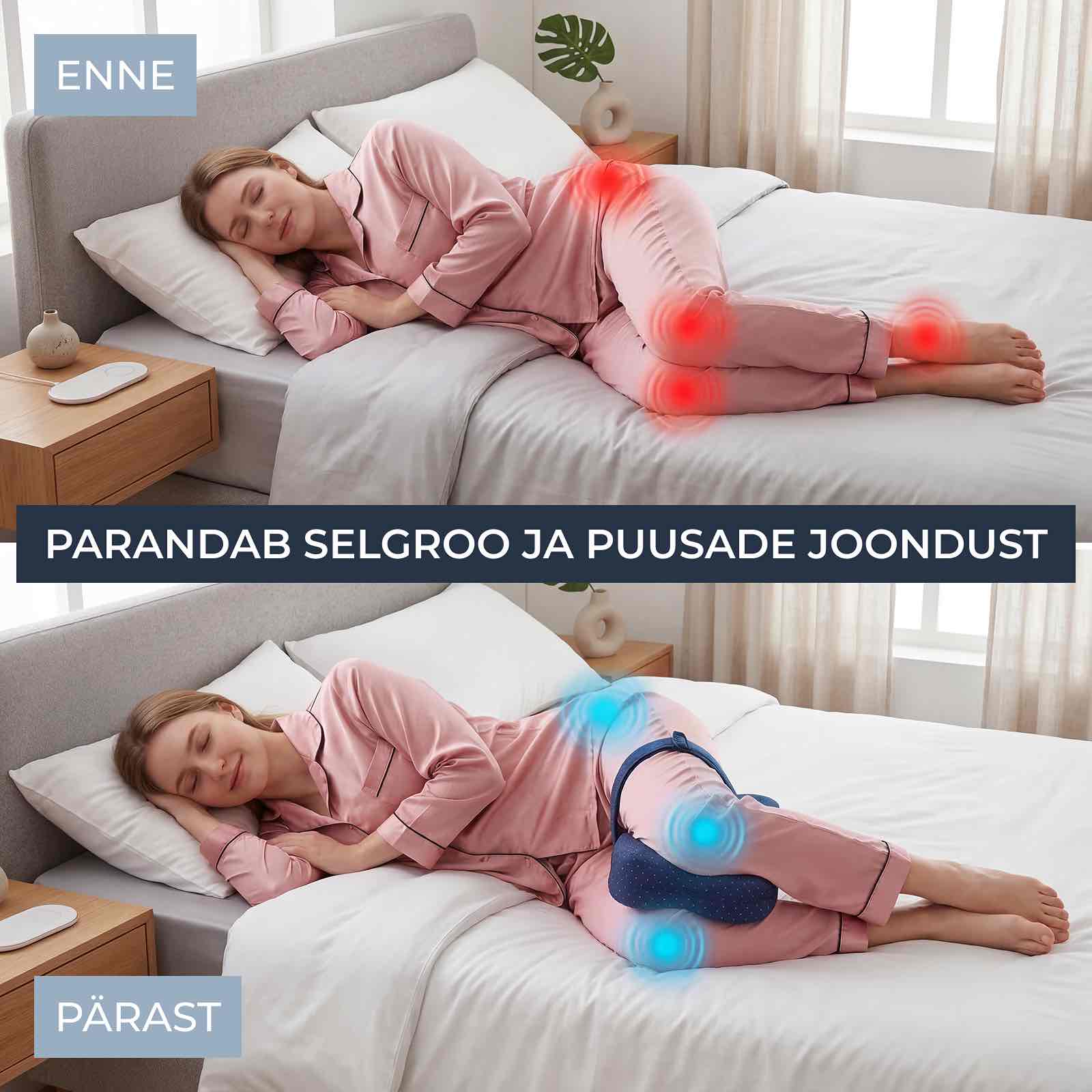 Uuringud näitavad, et üks peamisi põhjuseid, miks külili magades tekib puusa-, põlve- ja alaseljavalu, on ebapiisav tugi jalgade vahel . Kui ülemine jalg vajub ettepoole, võib see pöörata puusasid ja selgroogu, rikkuda loomulikku joondust ning tekitada kogu öö kestvat pinget.