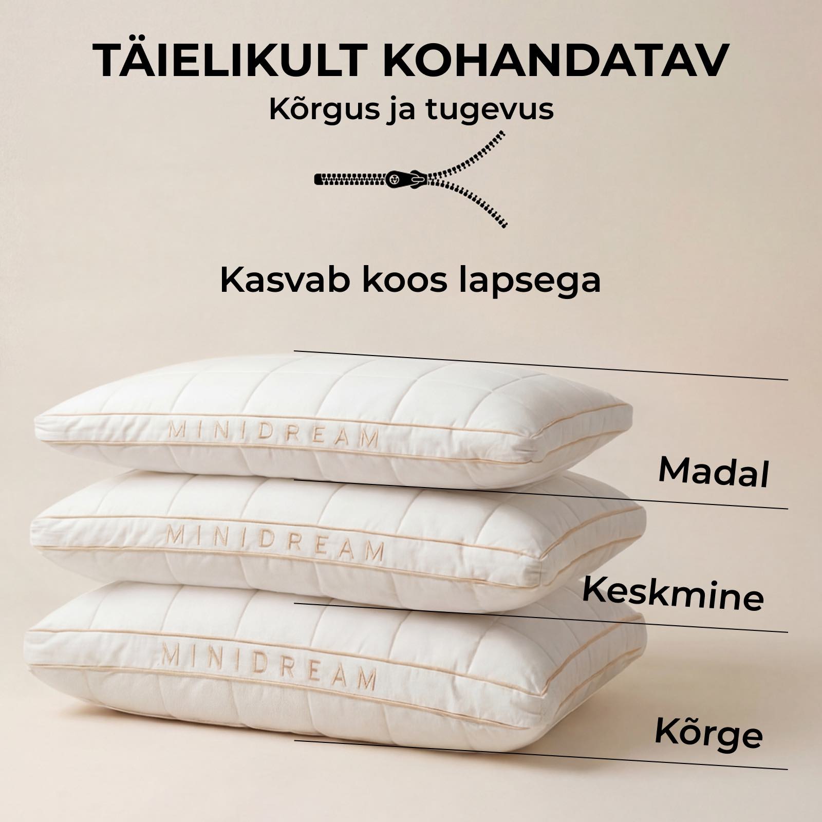 Erinevalt tavalistest lastepatjadest, mille kõrgus on fikseeritud ja mis ei hinga hästi, ühendab MINIDREAM reguleeritava täidise, ergonoomilise toe ja looduslikud hingavad materjalid ühes täiuslikus unelahenduses. See on loodud sobituma sinu lapsega paremini ja kestma kauem.
