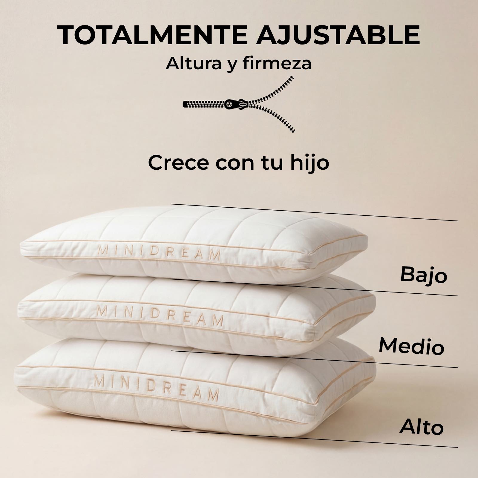 Por supuesto. MINIDREAM cuenta con un relleno ajustable que te permite modificar tanto la altura como la firmeza de la almohada. Así puede adaptarse al crecimiento de tu hijo y a sus necesidades de descanso.