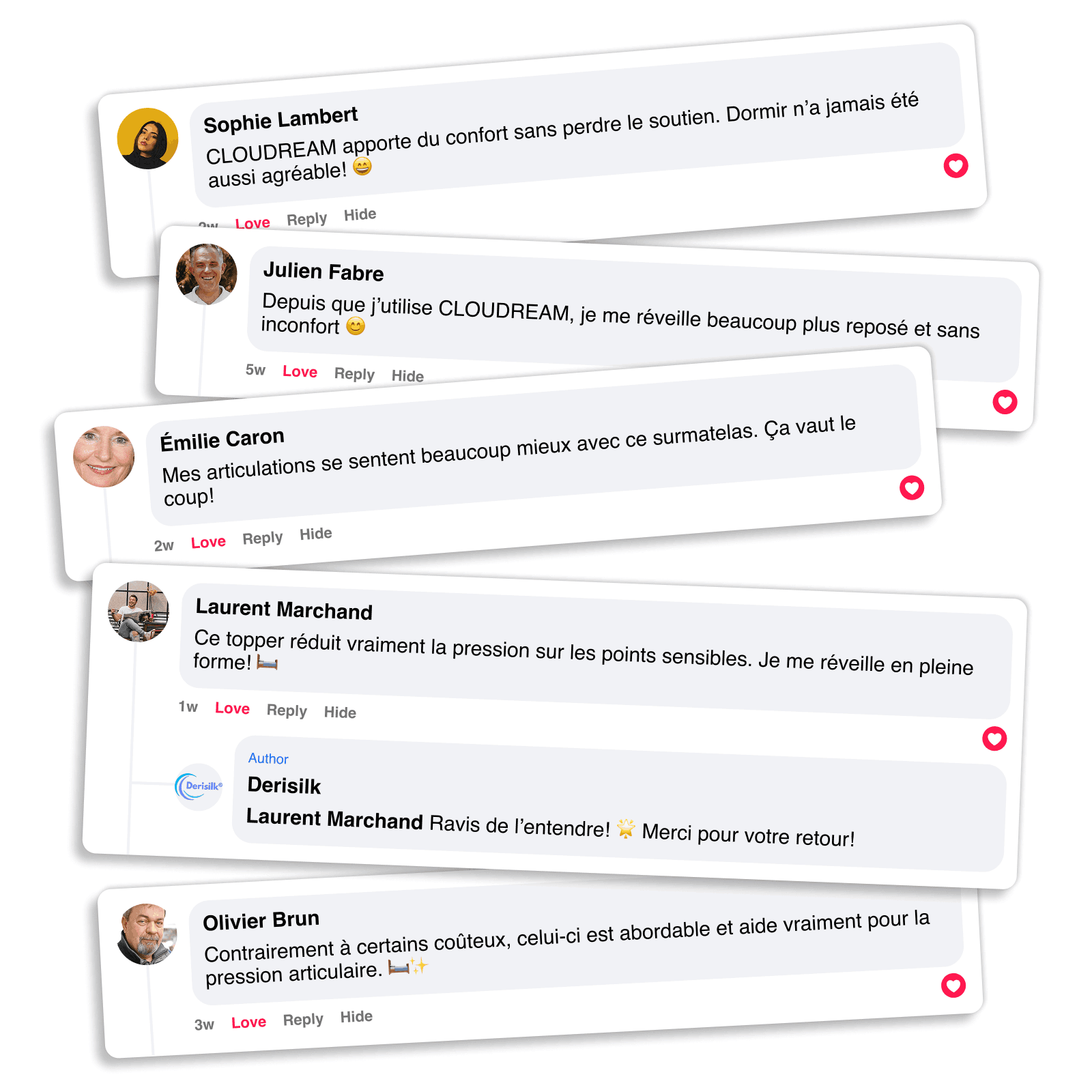 Absolument. CLOUDREAM est conçu pour réduire la pression sur les zones sensibles et douloureuses du corps, ce qui le rend particulièrement utile pour les personnes souffrant de fibromyalgie, de douleurs chroniques, d’arthrite, de raideurs ou d’inconfort lié à la pression pendant le sommeil.