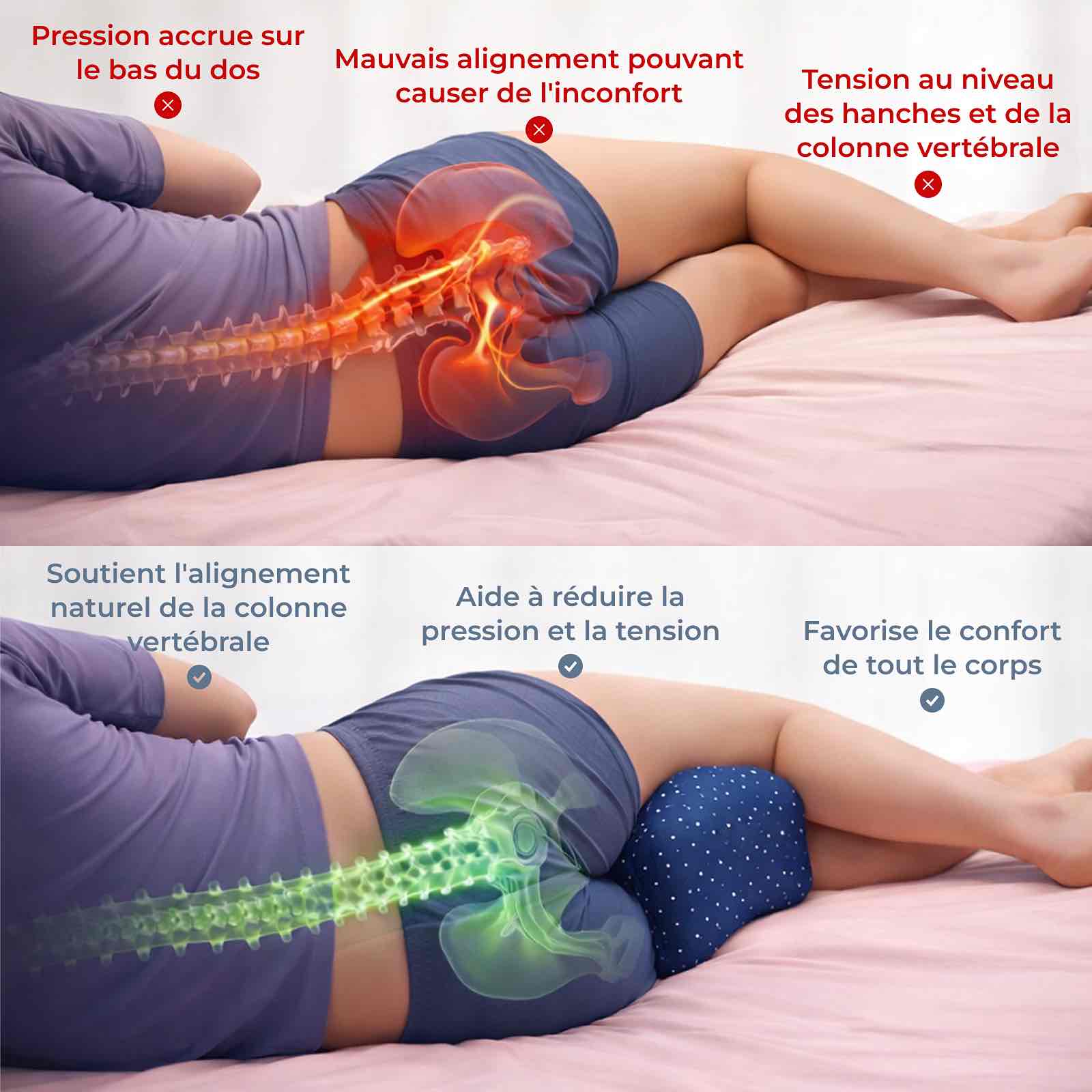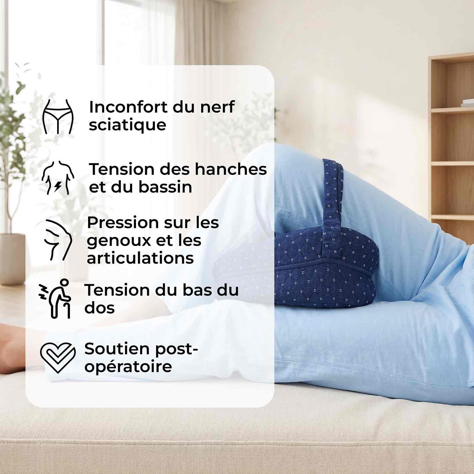 Les recherches montrent que l’une des principales causes d’inconfort à la hanche, au genou et au bas du dos chez les personnes qui dorment sur le côté est le manque de soutien adéquat entre les jambes. Quand la jambe du dessus tombe vers l’avant, elle exerce une torsion sur les hanches et la colonne vertébrale, perturbe l’alignement naturel et crée des tensions qui s’accumulent toute la nuit.
