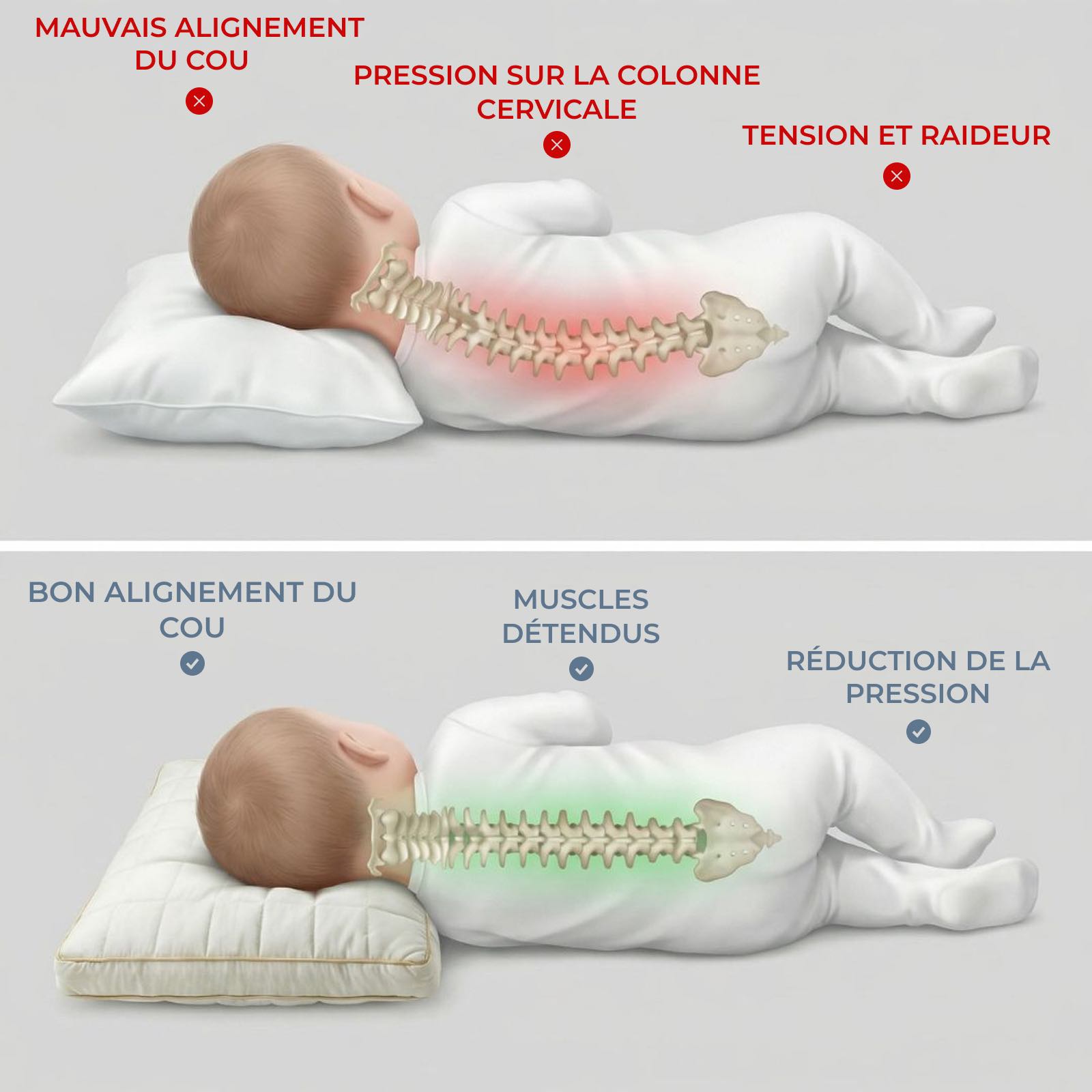 - L’inconfort causé par des oreillers trop hauts ou trop plats