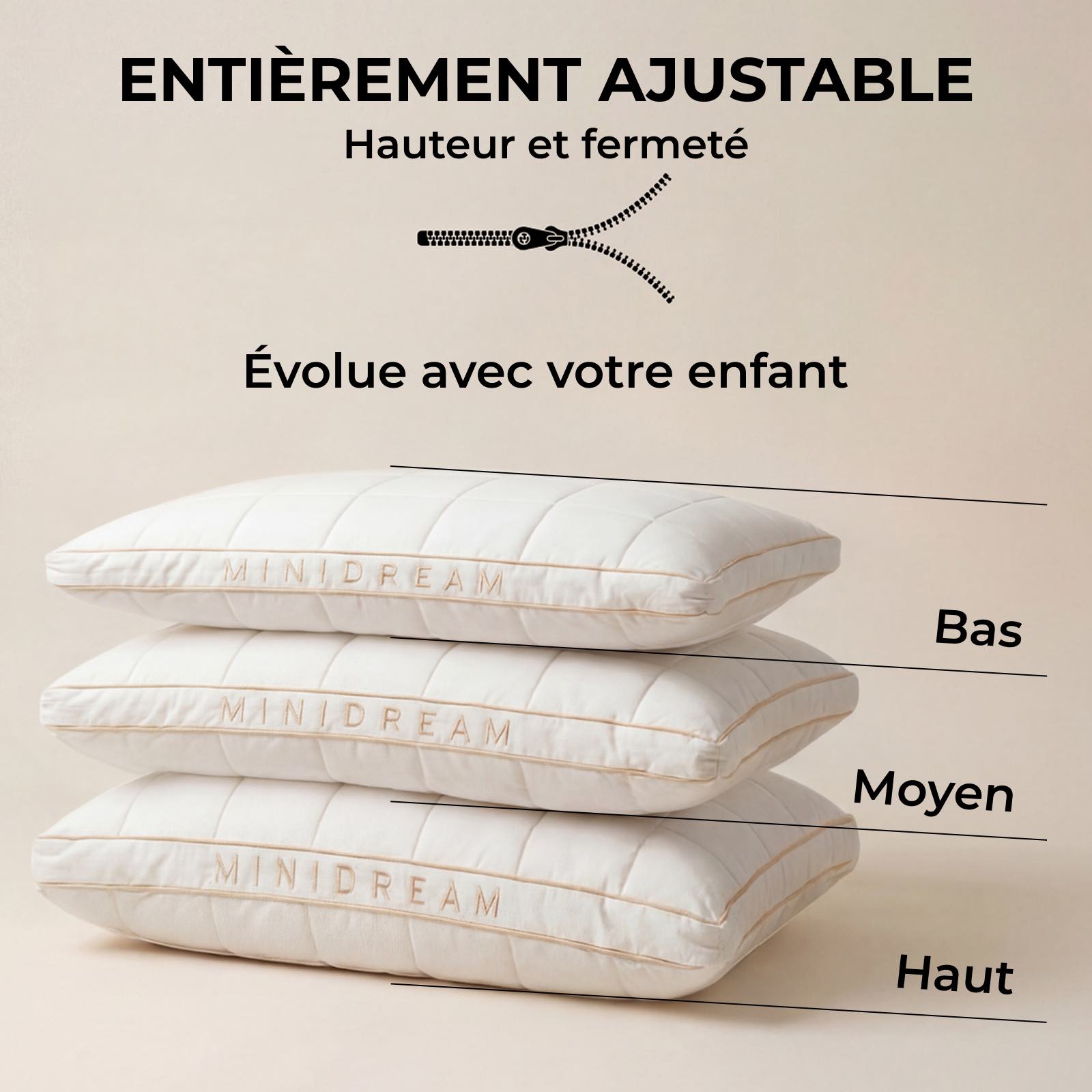 Bien sûr. MINIDREAM est doté d’un garnissage ajustable qui te permet de modifier la hauteur et la fermeté de l’oreiller. Il s’adapte ainsi à la croissance de ton enfant et à l’évolution de ses besoins de sommeil.