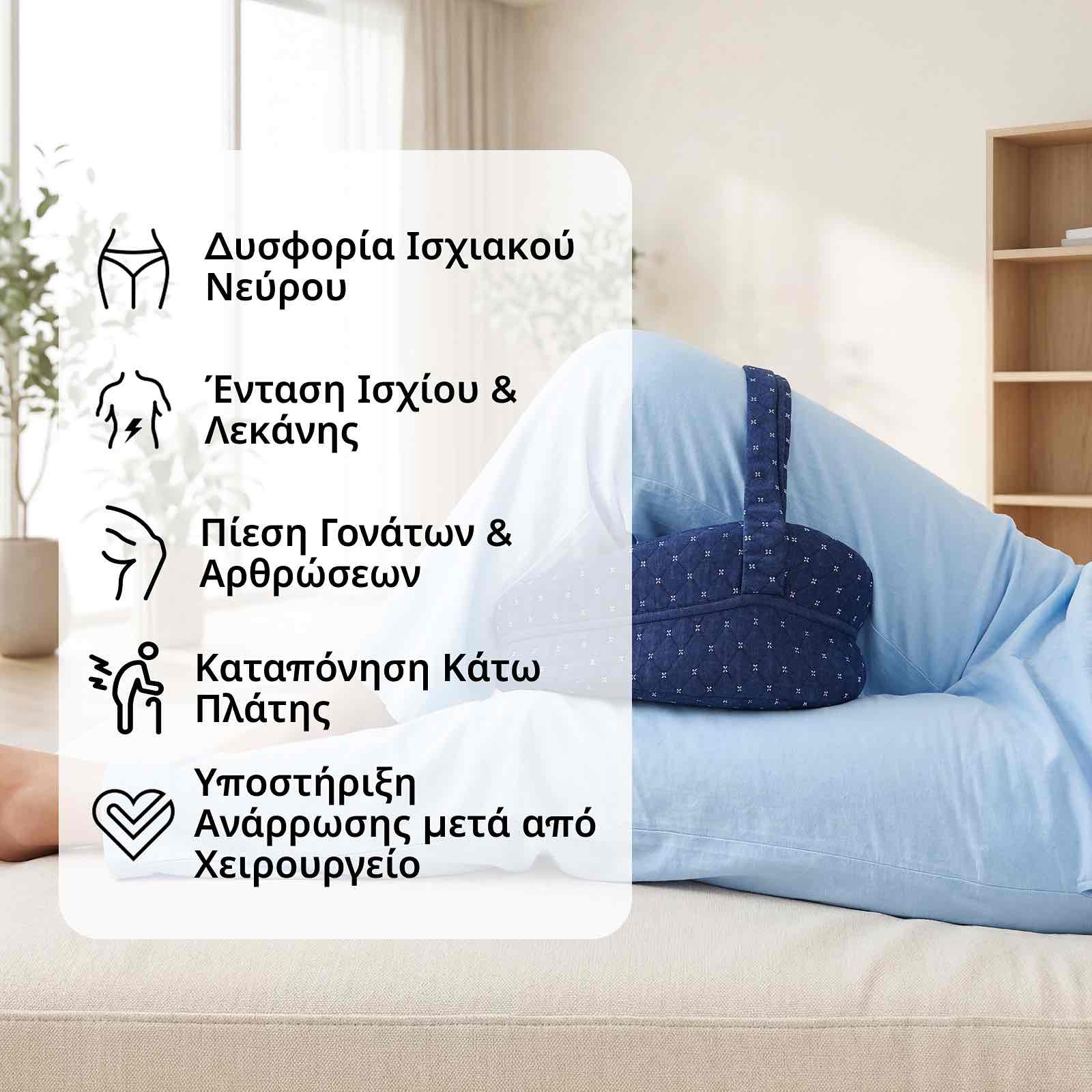 Απολύτως. Ο εργονομικός σχεδιασμός του μαξιλαριού μας προσφέρει στοχευμένη υποστήριξη που μπορεί να ανακουφίσει την ενόχληση από παθήσεις όπως η ισχιαλγία, ο πόνος στη μέση και άλλα.