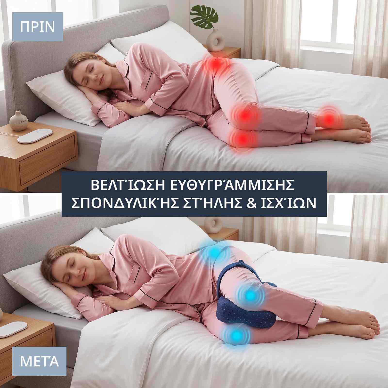Όταν κοιμάσαι στο πλάι χωρίς σωστή στήριξη ανάμεσα στα πόδια, το πάνω πόδι πέφτει μπροστά, στρίβοντας τους γοφούς, πιέζοντας τη μέση και φέρνοντας τα γόνατα σε άμεση επαφή. Νύχτα μετά τη νύχτα, αυτή η κακή ευθυγράμμιση δημιουργεί πίεση στο σώμα, προκαλεί ενόχληση σε βασικά σημεία και σε κάνει να ξυπνάς άκαμπτος, πονεμένος και εξαντλημένος.