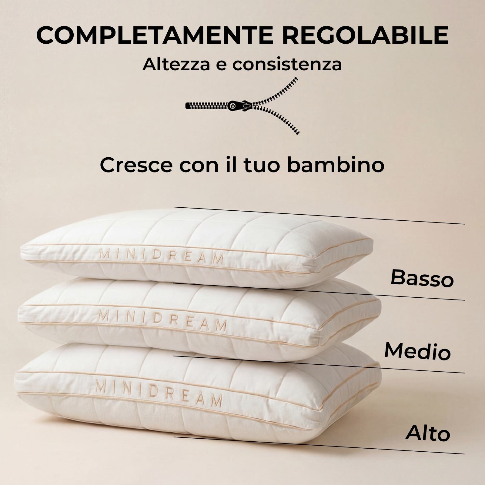 MINIDREAM è stato progettato fin dall’inizio per risolvere questo problema. Il suo riempimento regolabile, il supporto ergonomico e i materiali naturali traspiranti aiutano a mantenere una postura più sana di collo e colonna vertebrale, riducono il surriscaldamento e creano un ambiente di riposo calmo e confortevole di cui i bambini hanno bisogno per un sonno più profondo e rigenerante.