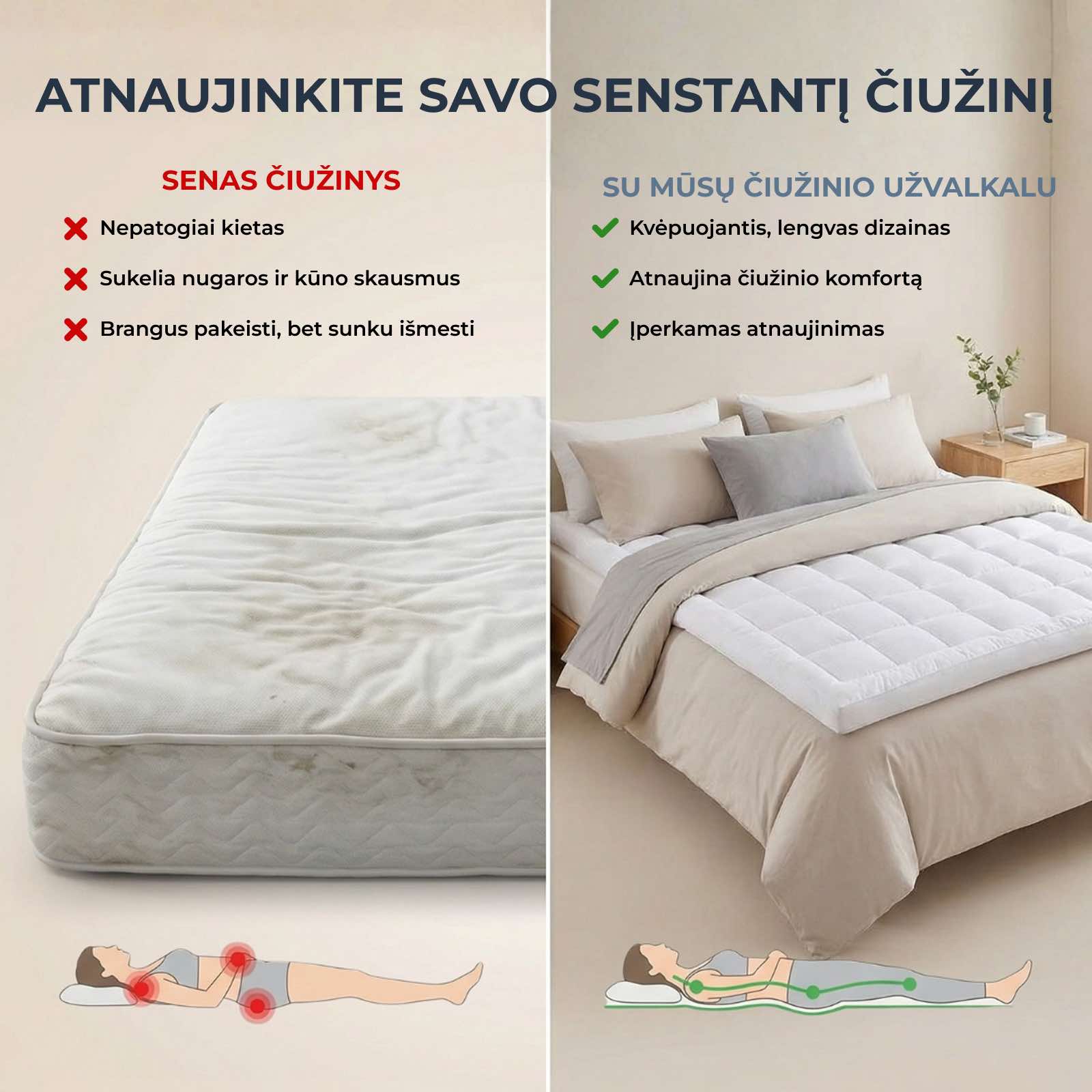 - Atnaujina bet kurį čiužinį – suteikia minkštą komfortą, išlaikant tvirtą atramą