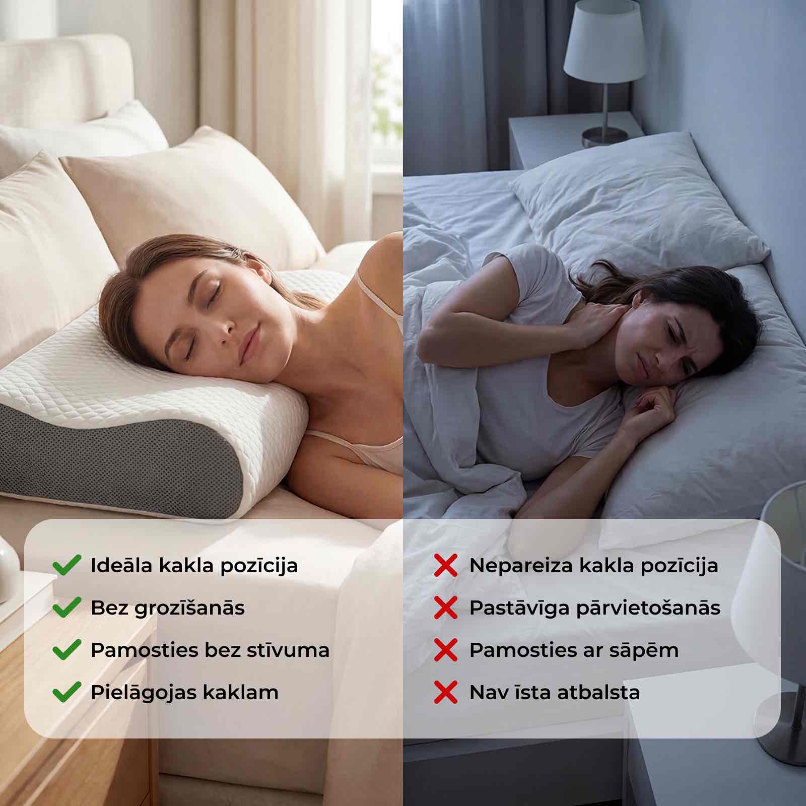 Problēma bieži sākas ar nepareizu spilvenu. Kad spilvens saplok, sabrūk vai vairs neatbalsta kakla dabisko izliekumu, mugurkauls iziet no līnijas un spriedze uzkrājas kaklā, plecos, žoklī un augšējā mugurā. Nakts pēc nakts tas izraisa stīvumu, sāpes, krākšanu, nemierīgu miegu un rītus, kad jūties iztukšots, nevis atpūties.