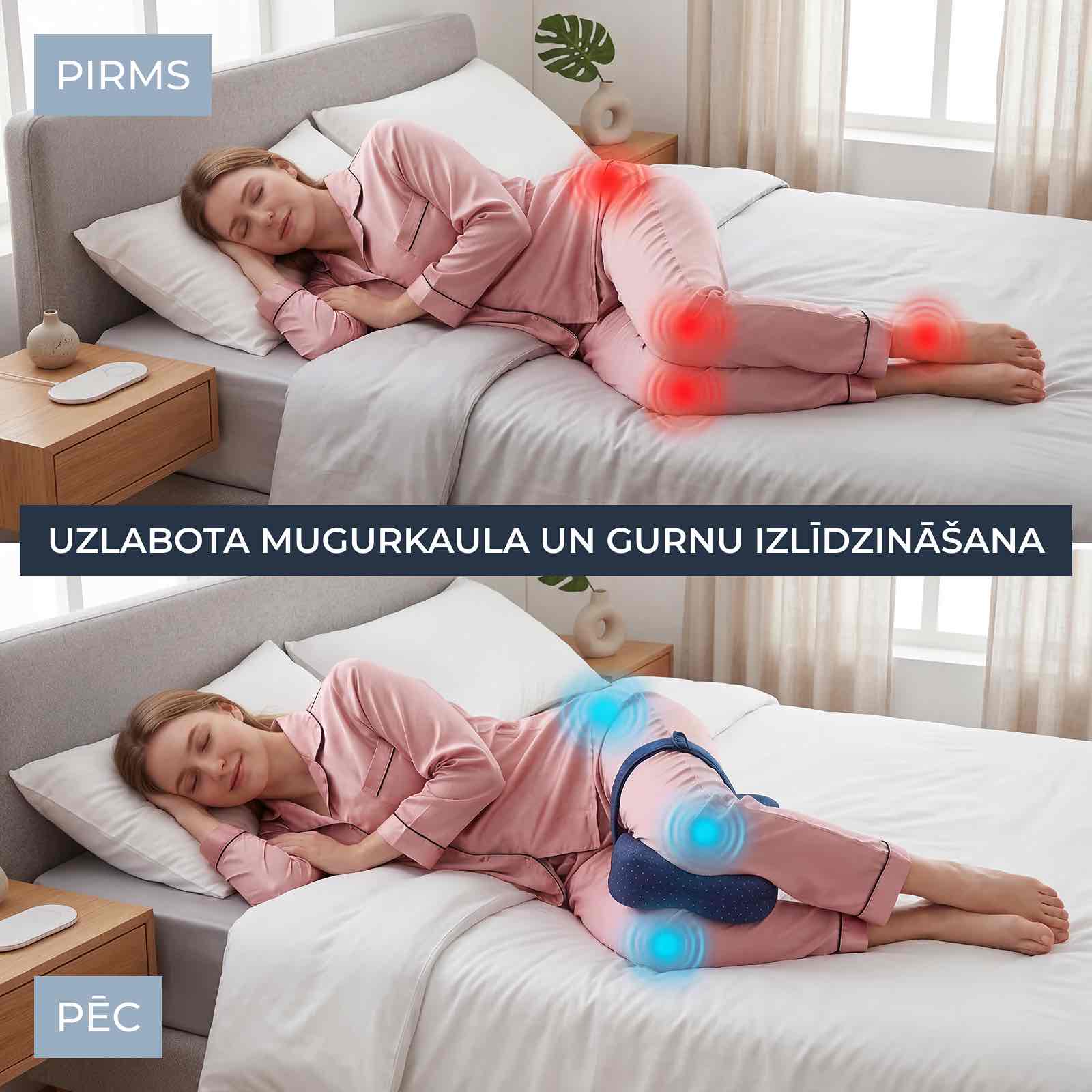 Kad guli uz sāniem bez pareiza atbalsta starp kājām, augšējā kāja noslīd uz priekšu, sagriežot gurnus, noslogojot muguras lejasdaļu un spiežot ceļus kopā. Nakts pēc nakts šī nepareizā pozīcija rada spiedienu visā ķermenī, izraisa diskomfortu svarīgās vietās un liek mosties stīvam, sāpīgam un nogurušam.