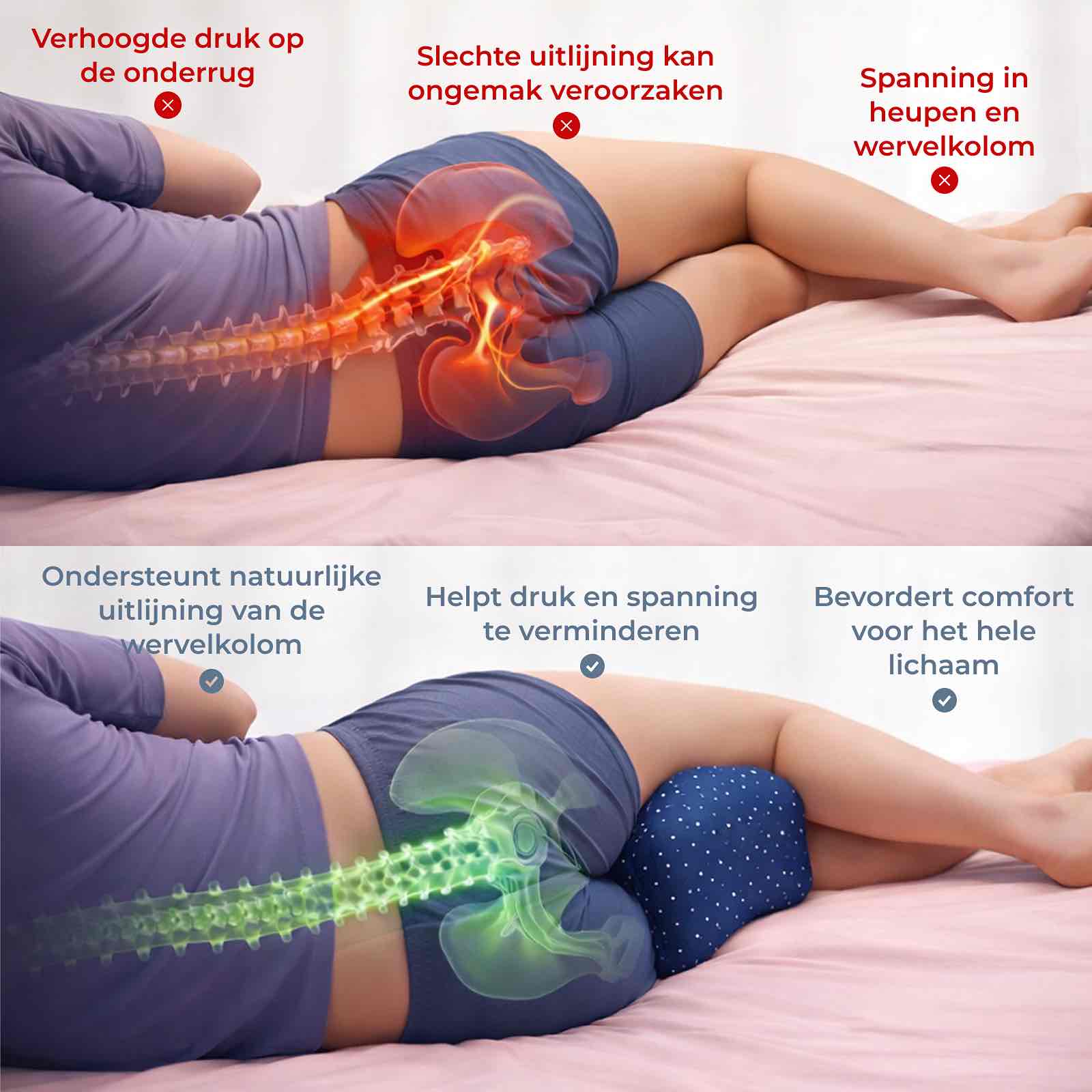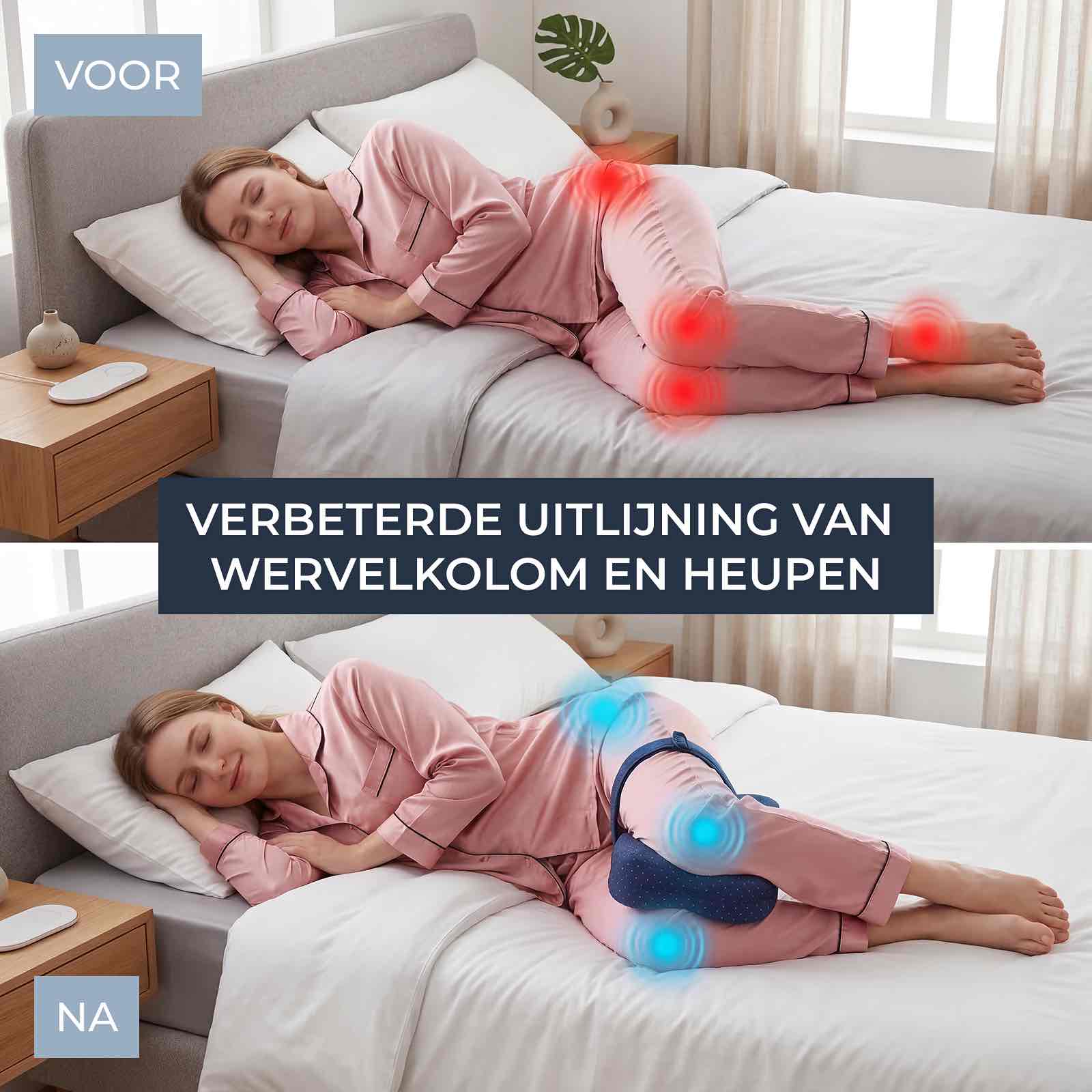 Als je op je zij slaapt zonder goede ondersteuning tussen je benen, zakt je bovenbeen naar voren, draaien je heupen, komt er spanning op je onderrug en drukken je knieën tegen elkaar. Nacht na nacht zorgt die verkeerde houding voor druk in je lichaam, ongemak op gevoelige plekken en word je stijf, pijnlijk en vermoeid wakker.