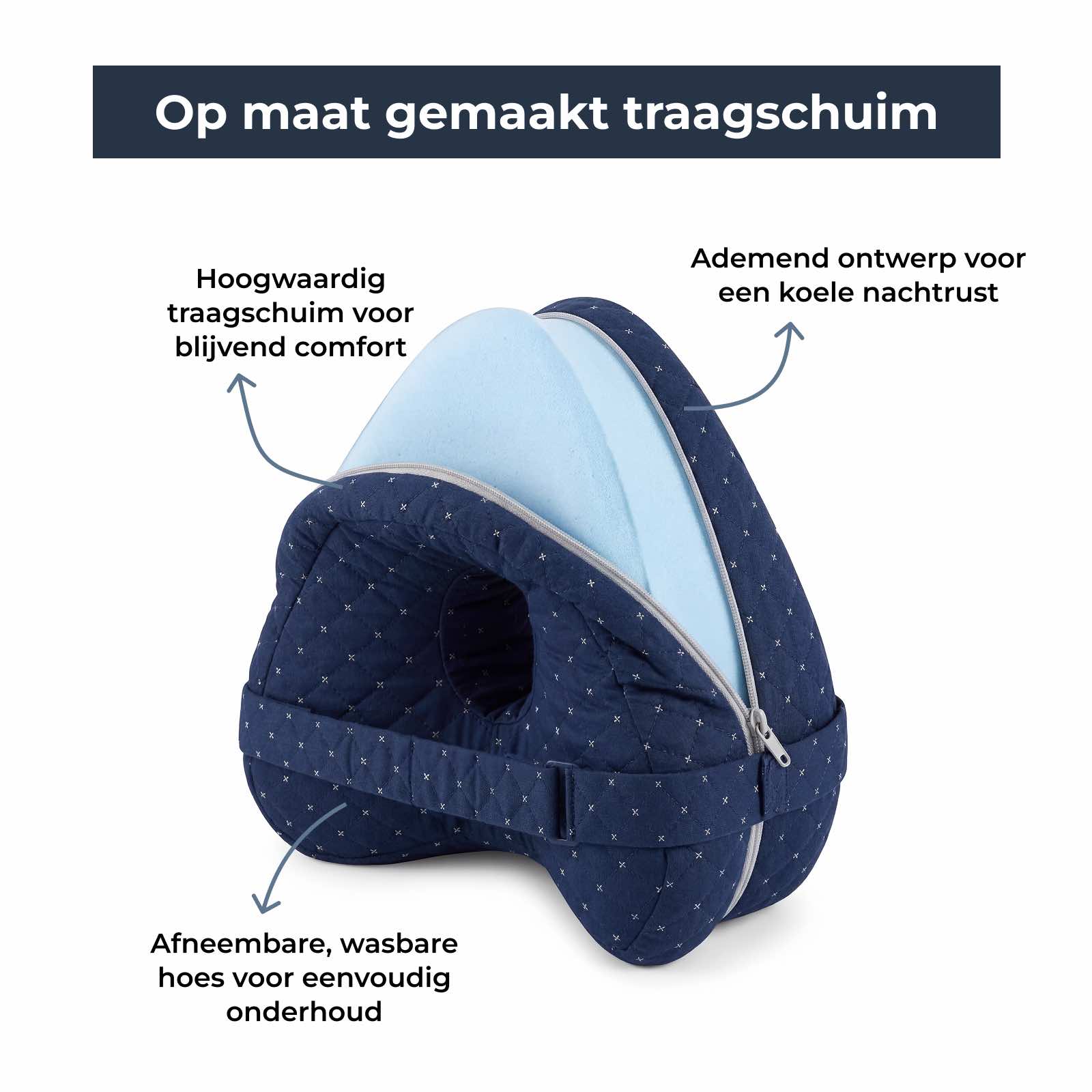 Ons beenkussen is gemaakt van ademende materialen die lucht laten circuleren, zodat warmte niet ophoopt en je de hele nacht koel blijft.