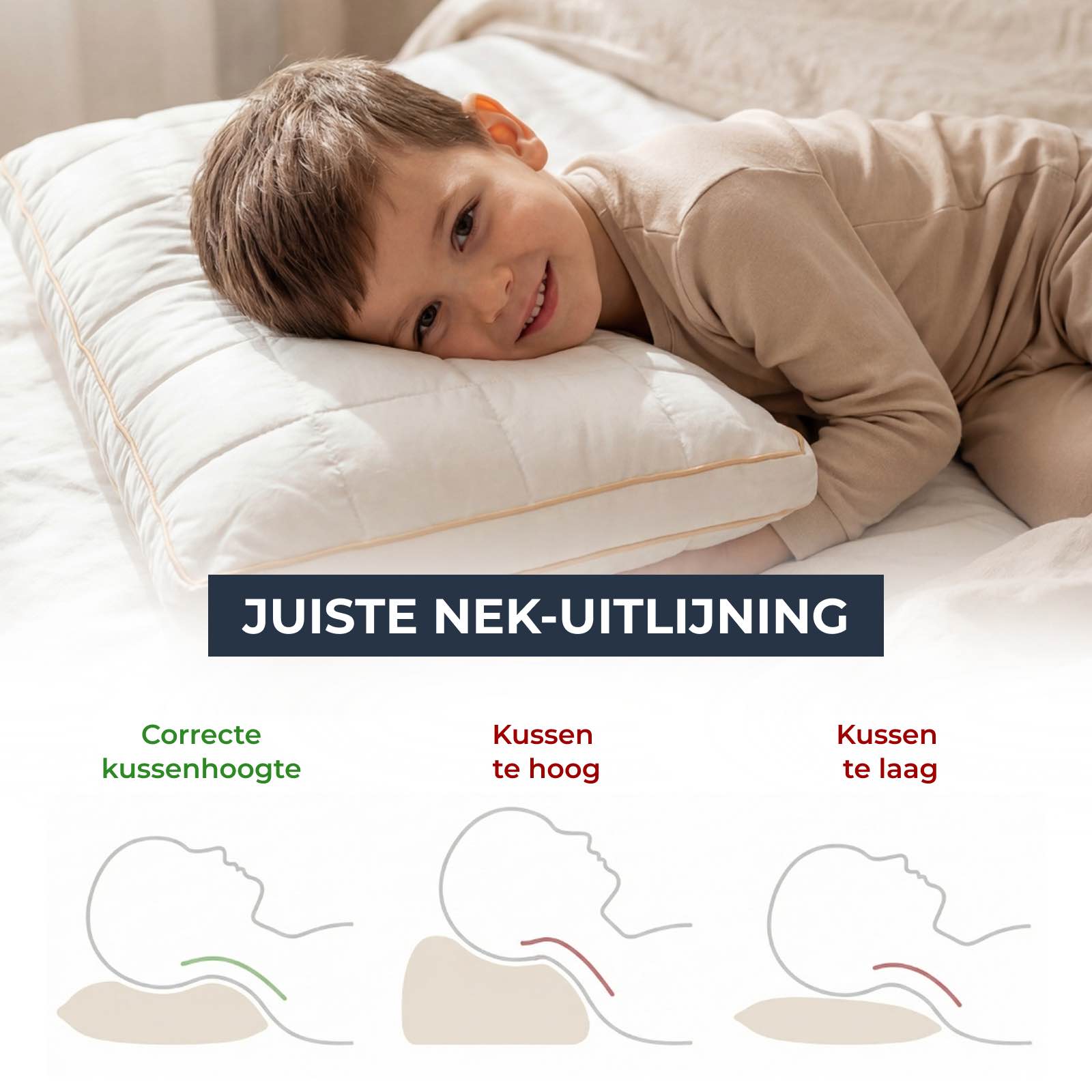 Een van de grootste oorzaken van onrustige, slechte slaap bij jonge kinderen is het gebruik van een kussen dat niet past bij hun formaat, slaaphouding of groeifase. Als een kussen te hoog, te hard, te warm of te slap is, verstoort dat de natuurlijke houding, houdt het vocht vast en wordt het moeilijker voor het lichaam van je kind om ’s nachts volledig te ontspannen.