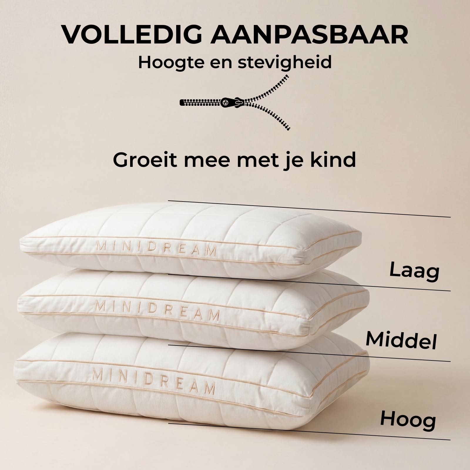 Zeker. MINIDREAM heeft een verstelbare vulling, zodat je zowel de hoogte als de stevigheid kunt aanpassen. Zo groeit het kussen mee met je kind en hun veranderende slaapbehoeften.
