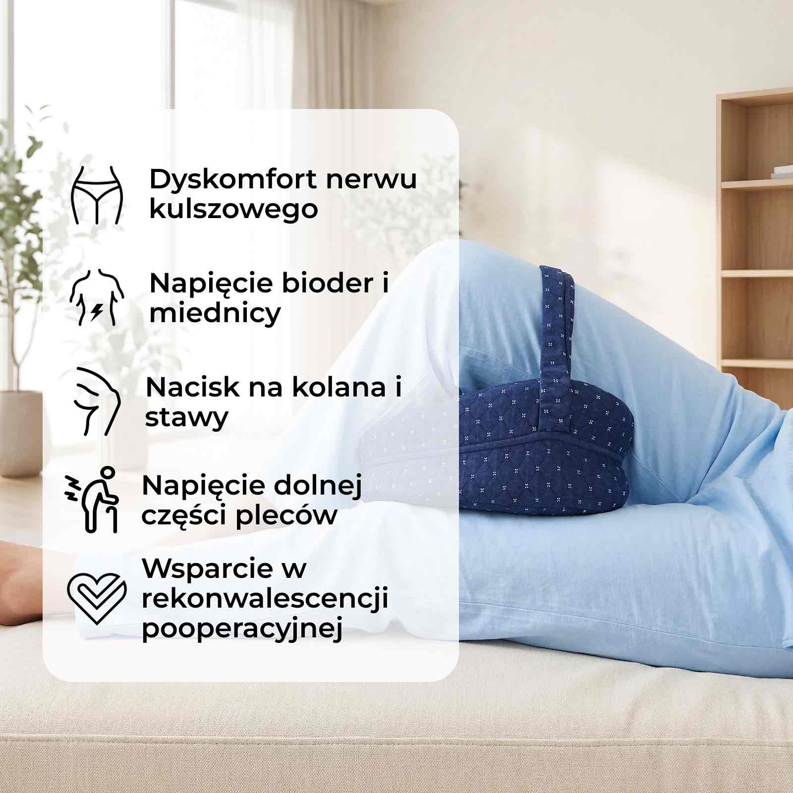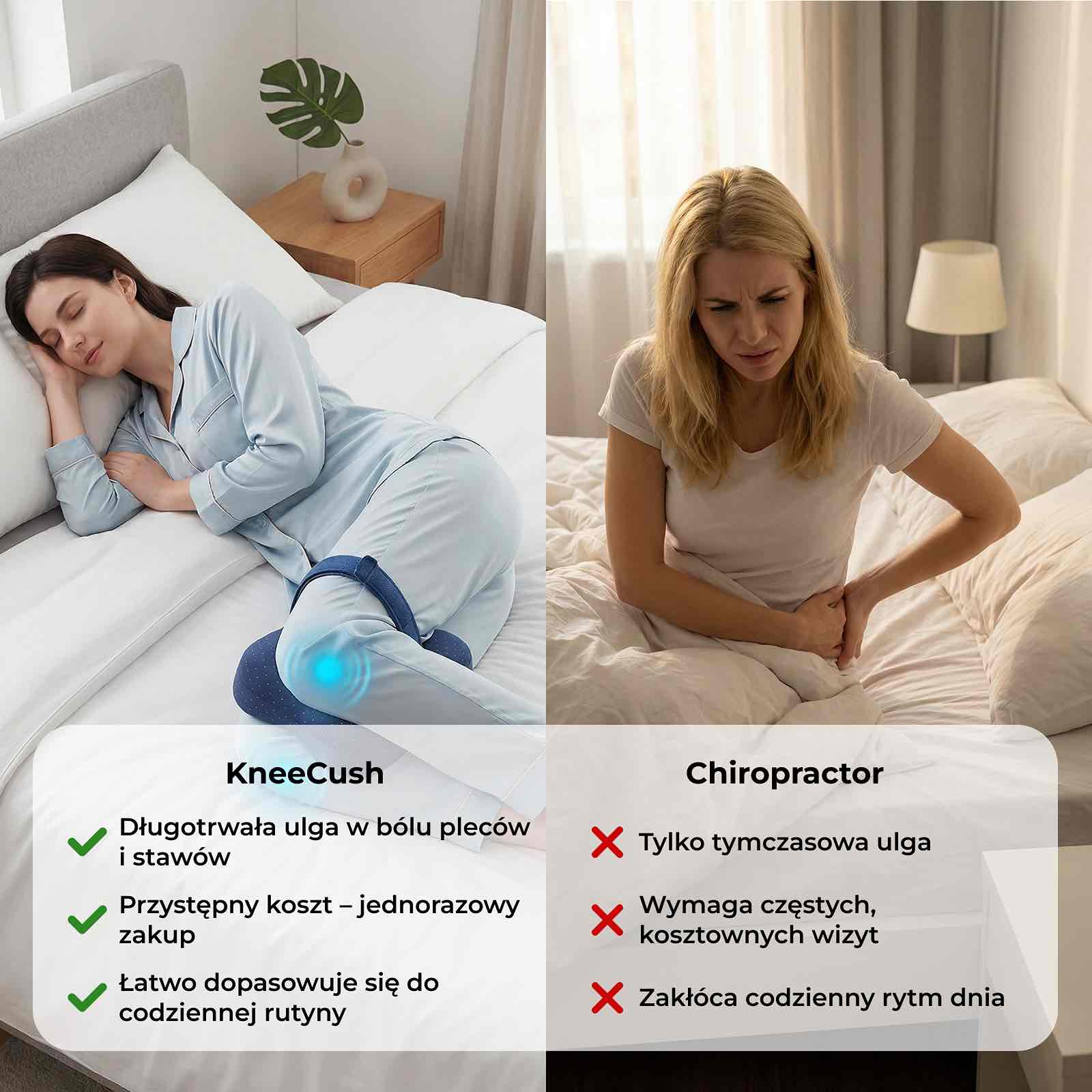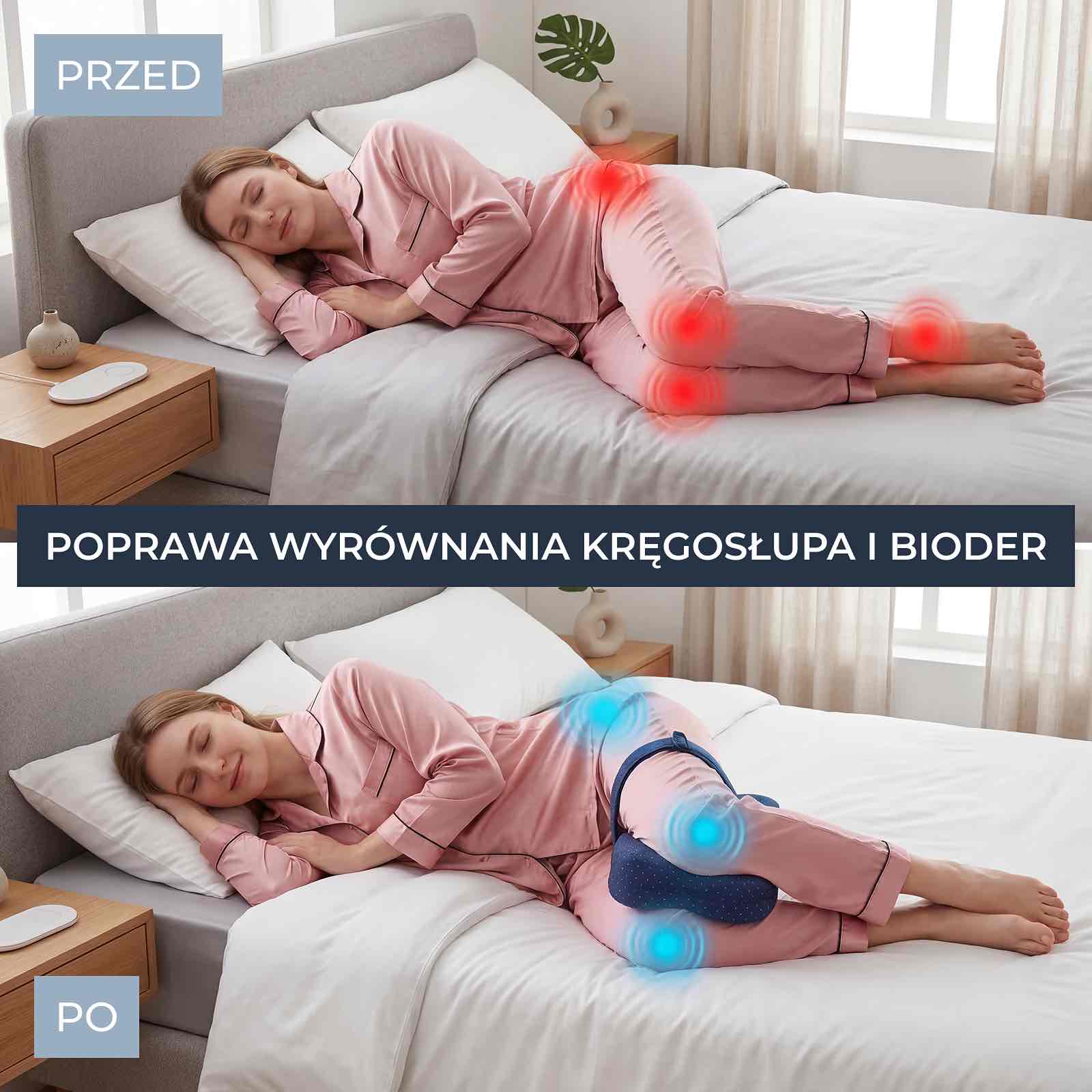 Badania sugerują, że jednym z głównych powodów bólu bioder, kolan i dolnej części pleców u osób śpiących na boku jest brak odpowiedniego podparcia między nogami. Gdy górna noga opada do przodu, może to powodować skręcenie bioder i kręgosłupa, zaburzać naturalne ułożenie ciała i wywoływać napięcie narastające przez całą noc.