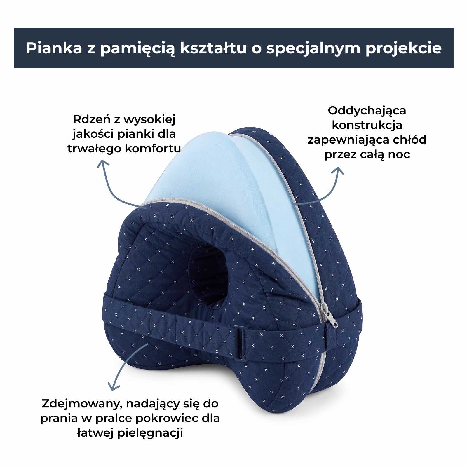 Gdy śpisz na boku bez odpowiedniego podparcia między nogami, górna noga opada do przodu, skręcając biodra, obciążając dolną część pleców i powodując, że kolana stykają się bezpośrednio ze sobą. Noc po nocy takie niewłaściwe ułożenie zwiększa nacisk na ciało, wywołuje dyskomfort w kluczowych miejscach i sprawia, że budzisz się sztywny, obolały i zmęczony.