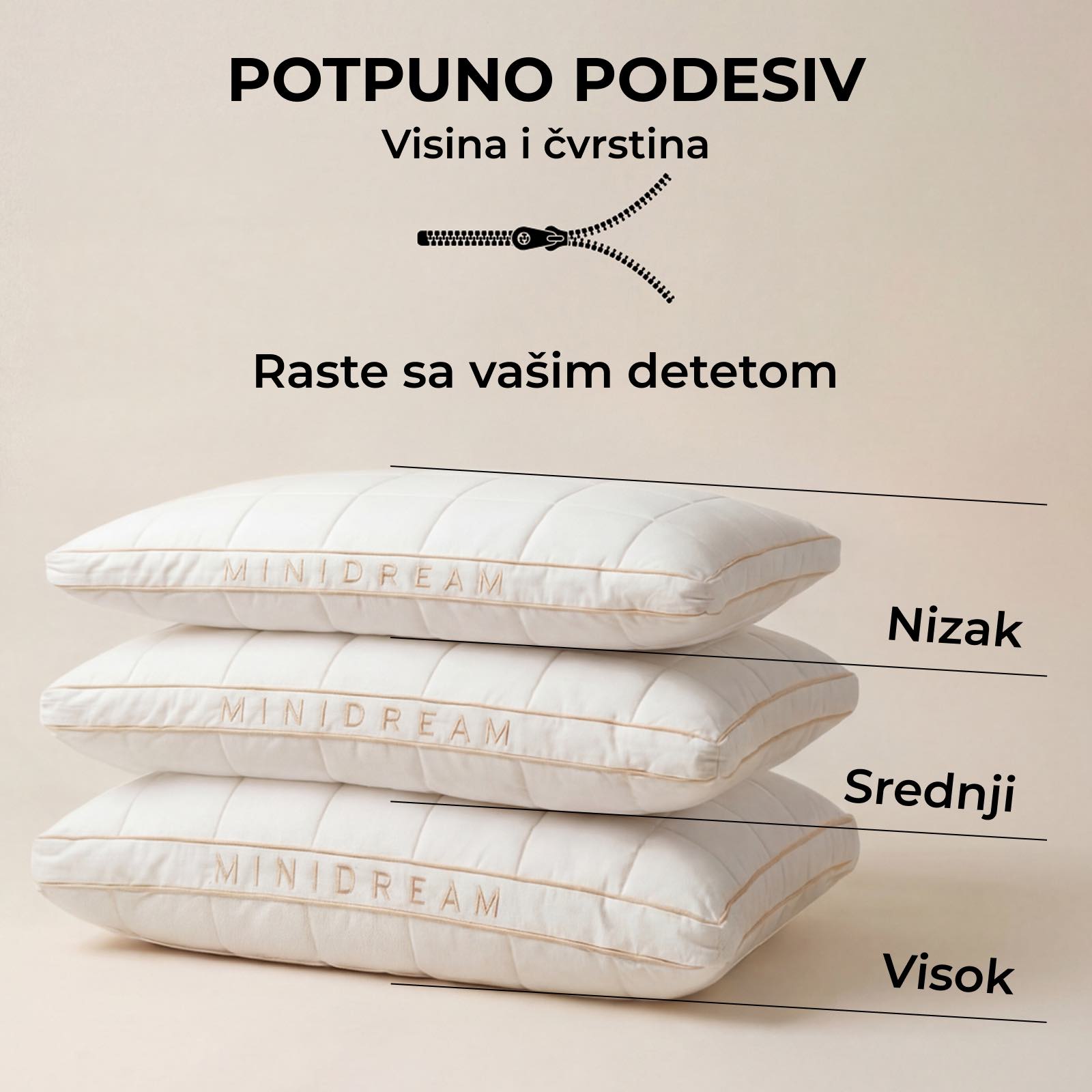 Naravno. MINIDREAM ima podesivo punjenje, pa možeš menjati visinu i tvrdoću jastuka. Tako se lako prilagođava kako tvoje dete raste i menjaju se njegove potrebe za snom.